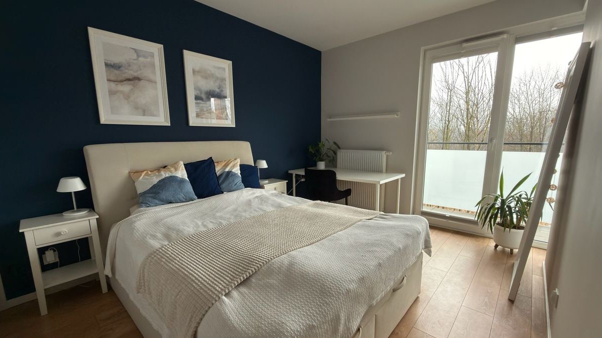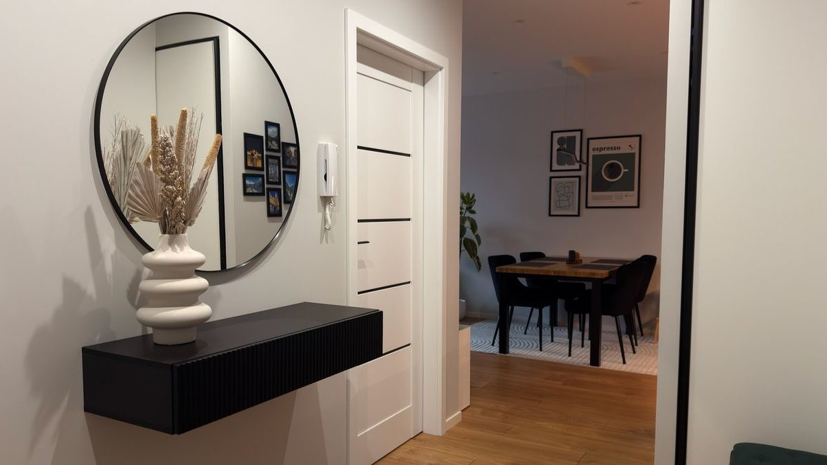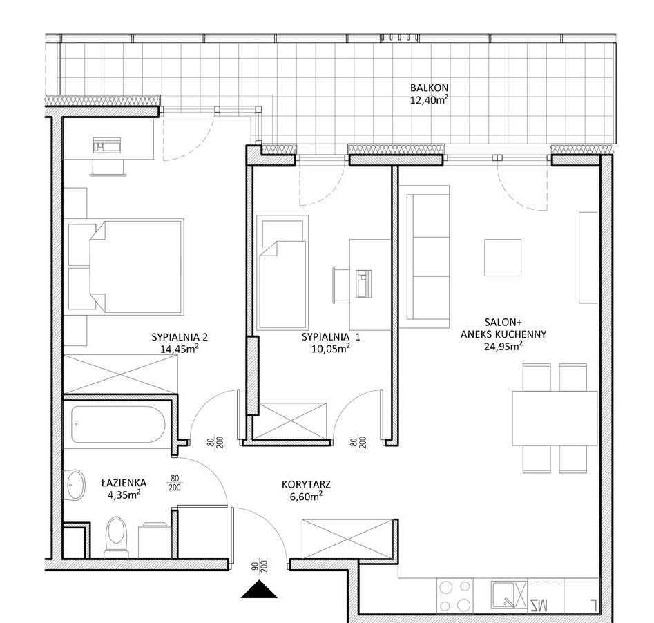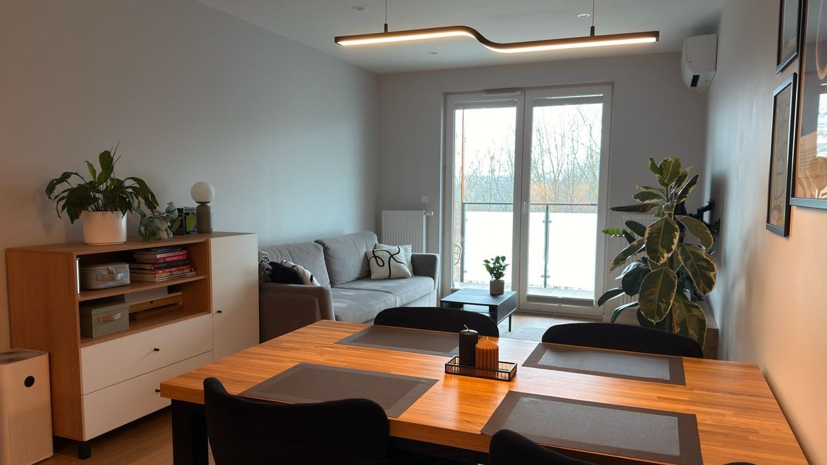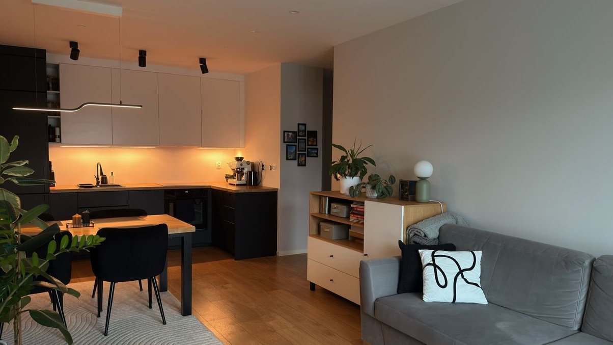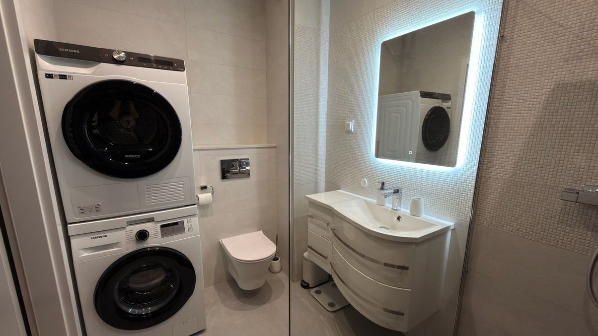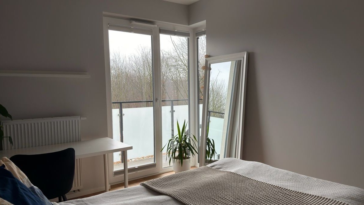 Układ: sypialnia, pokój, salon z aneksem kuchennym, łazienka, przedpokój z wydzielonym schowkiem za drzwiami przesuwnymi – praktyczne, ukryte pomieszczenie gospodarcze. Mieszkanie posiada 12-metrowy balkon z ekspozycją zachodnią, na który wychodzi się z każdego pomieszczenia. Zamontowana klimatyzacja zapewnia komfort przez cały rok.