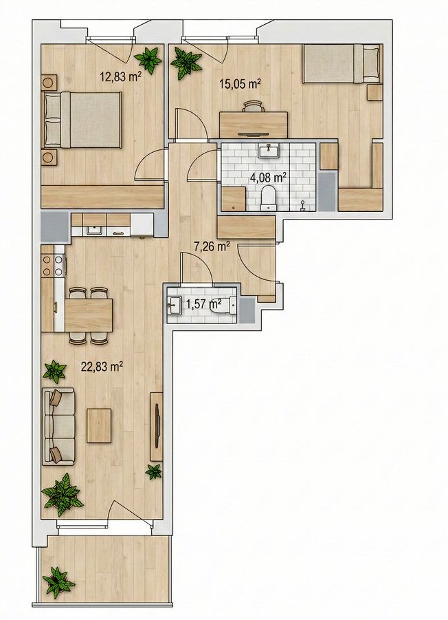 Gotowe do odbioru 3 pokoje, 63,8 m² z dużą strefą dzienną 22,8 m² i wygodnym układem dwóch sypialni.