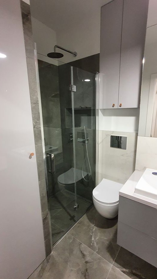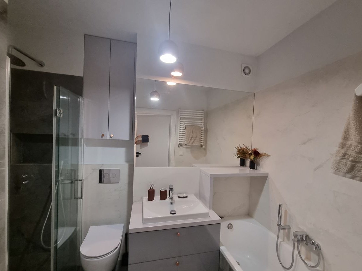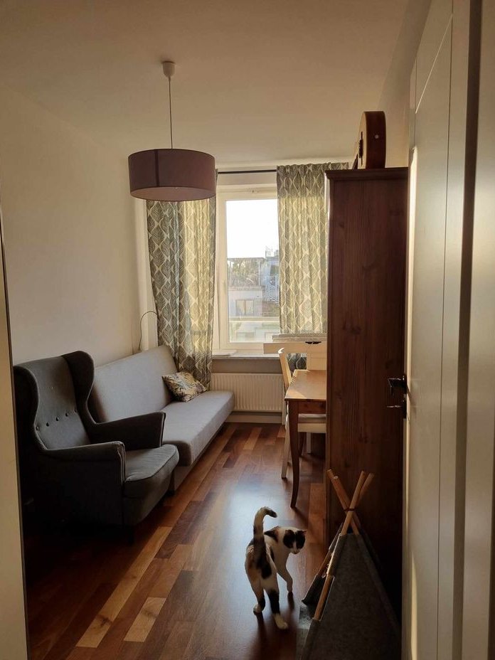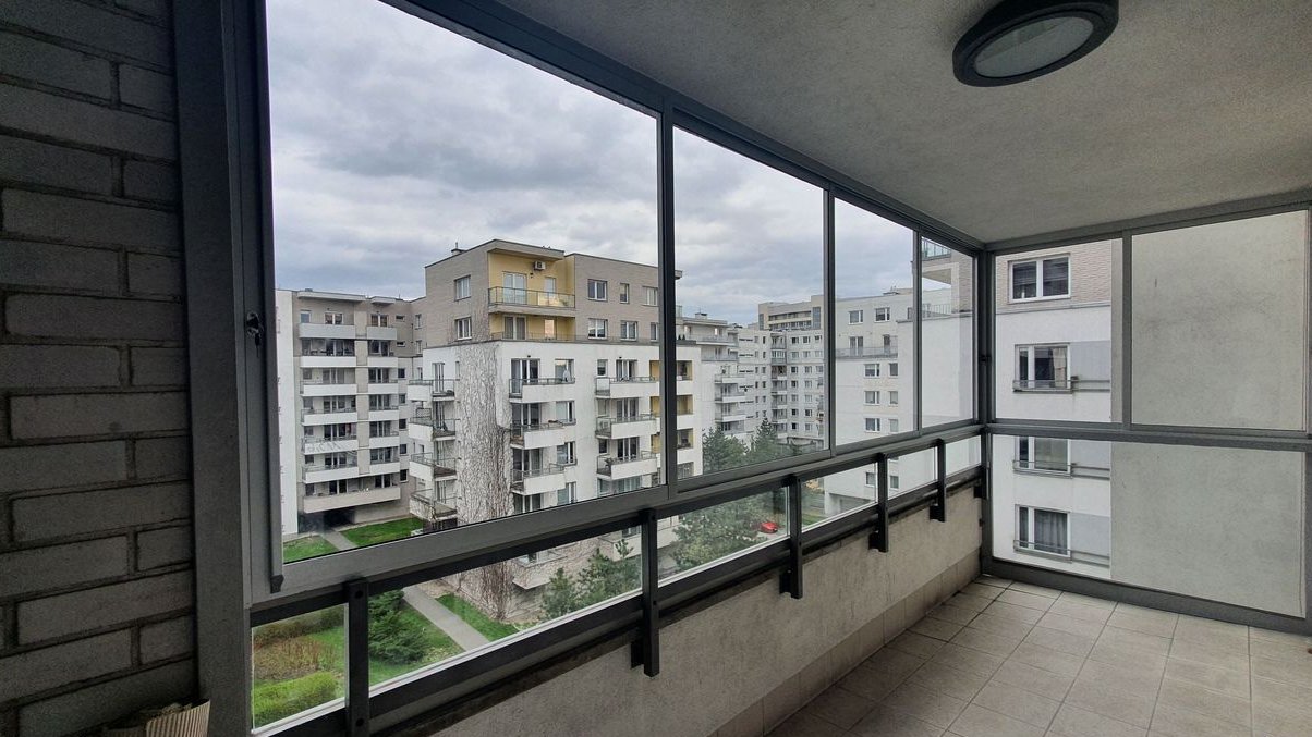 Good morning, the subject of this announcement is a 3-room apartment with an area of 68.5 sq. m., located in the Marina Mokotów estate in Warsaw. The apartment is situated on the 5th floor, is very well-lit, and double-sided. It features a large balcony (8.9 sq. m.), which we have additionally enclosed to increase its functionality. The living room, with a kitchenette open via a kitchen island, creates a living space of approximately 30 sq. m. The bathroom, designed with both a bathtub and a shower, also accommodates a built-in washing machine with practical storage space. Additionally, there is a separate toilet. The sleeping area consists of two well-proportioned rooms/bedrooms with large windows and a view over the roofs of neighboring buildings. In the hallway, there are two spacious built-in wardrobes with mirrors.