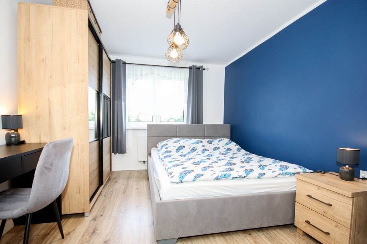 Mieszkanie posiada dwie sypialnie – jedna z nich pozostaje pusta i daje możliwość własnej aranżacji (pokój dziecięcy, gabinet, garderoba), natomiast druga wyposażona jest w duże łóżko oraz pojemną szafę.