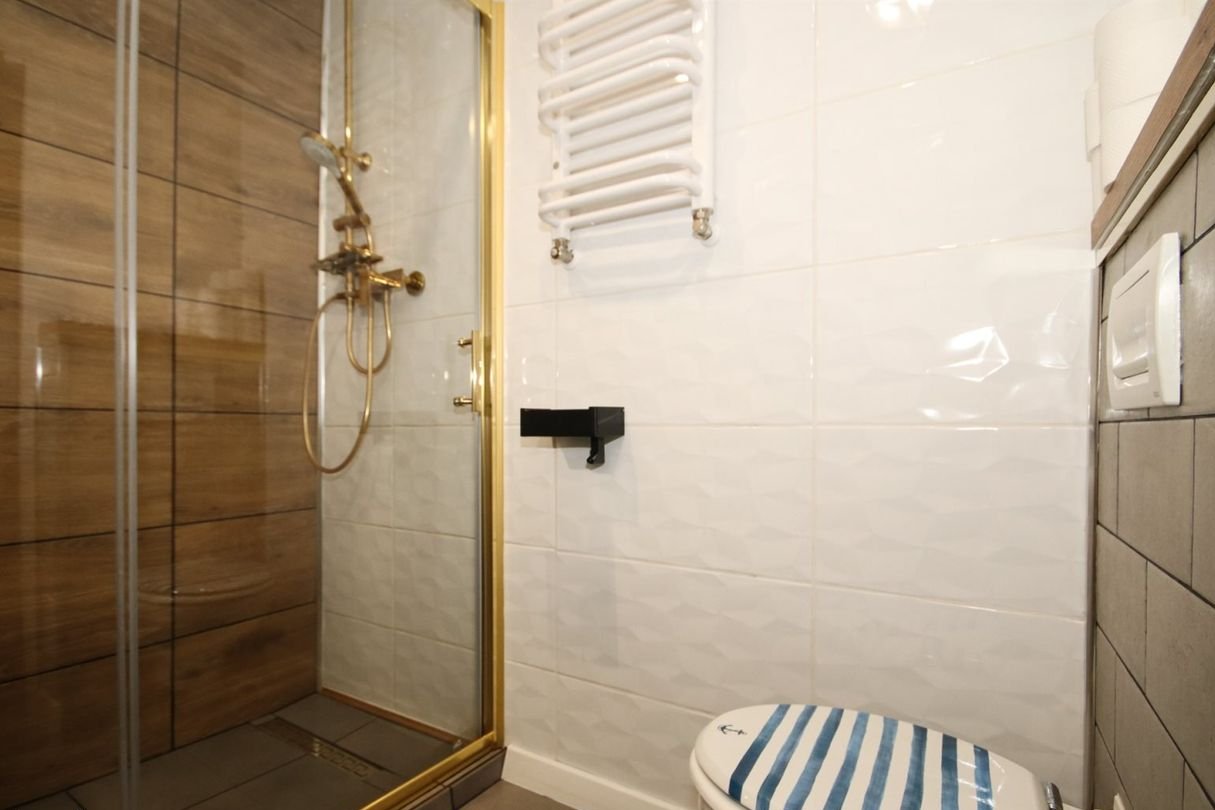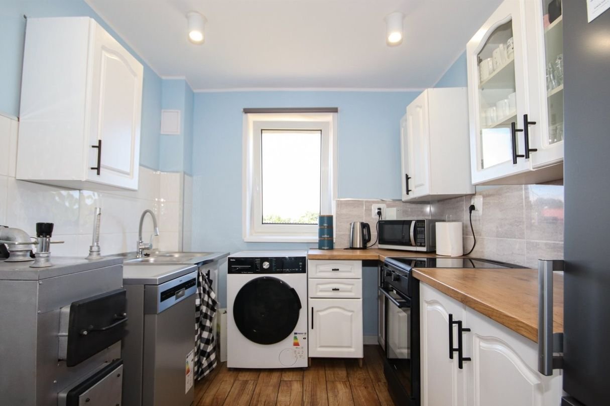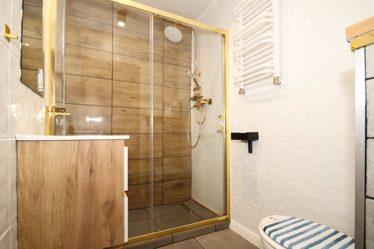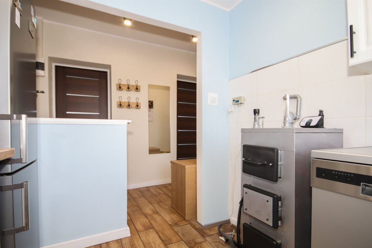 Kuchnia jest jasna i funkcjonalna, w pełni wyposażona w sprzęty AGD, w tym zmywarkę oraz kuchenkę elektryczną. Z okna rozpościera się przyjemny widok na okolicę. Łazienka utrzymana w nowoczesnym stylu, z odpływem liniowym pod prysznicem. Ogrzewanie oraz podgrzewanie wody z pieca na paliwo stałe, bojler o pojemności 120 L.