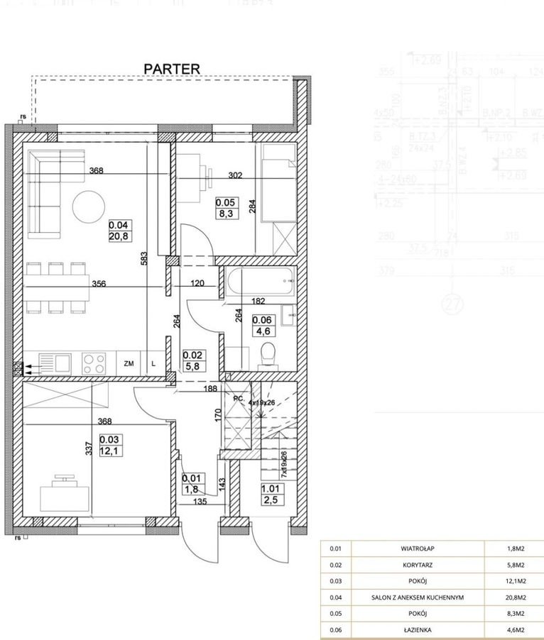 salon z aneksem kuchennym 20,80 m2