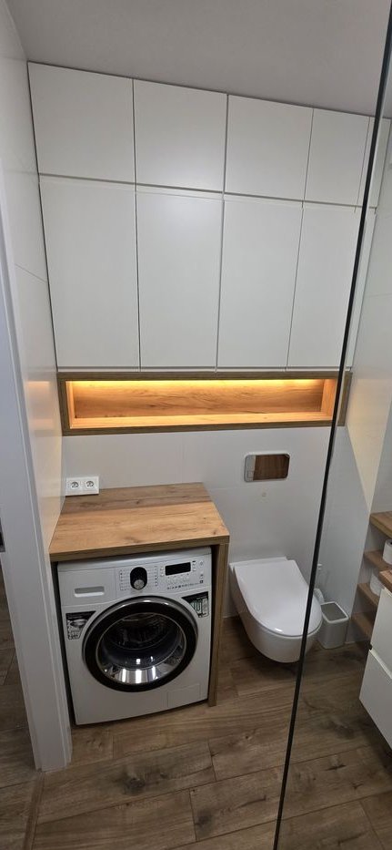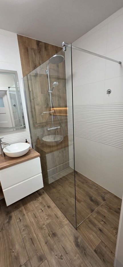 Łazienka – ogrzewanie podłogowe elektryczne ze sterownikiem (harmonogram), prysznic walk-in z odpływem liniowym, deszczownica, termostat Hansgrohe, WC rimless Villeroy & Boch, zabudowa na wymiar, pralka.