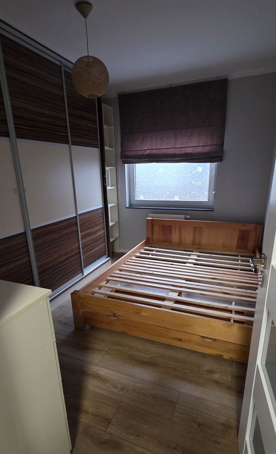 Sypialnia – duża szafa na całą ścianę (ok. 3 m), łóżko pod materac 160×200, komoda i regał na książki.