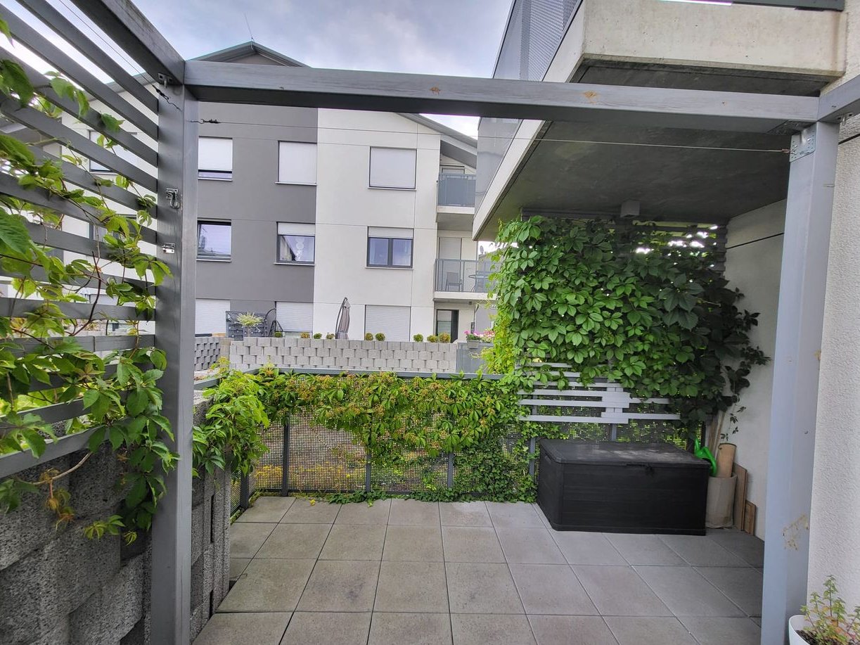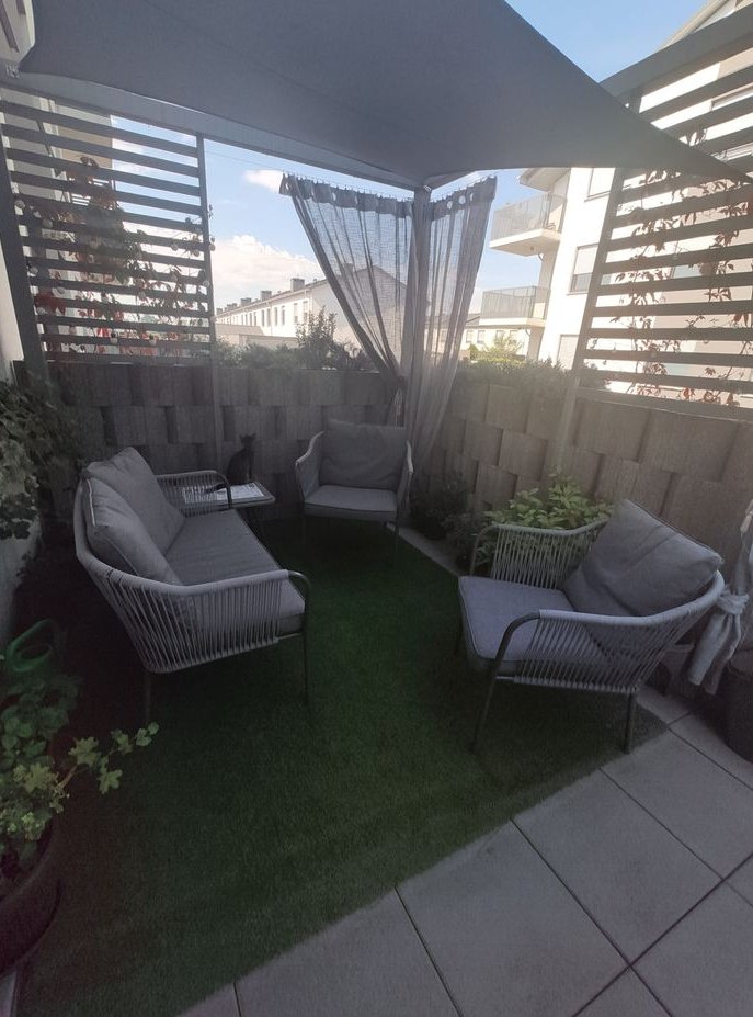 Taras 13 m² – zagospodarowany, drewniana pergola; zostaje skrzynia + żagiel z osprzętem + sztuczna trawa; rozrośnięty winobluszcz dający prywatność; możliwość dodatkowych nasadzeń w gazonach; opcja powiększenia tarasu o ok. 9 m².