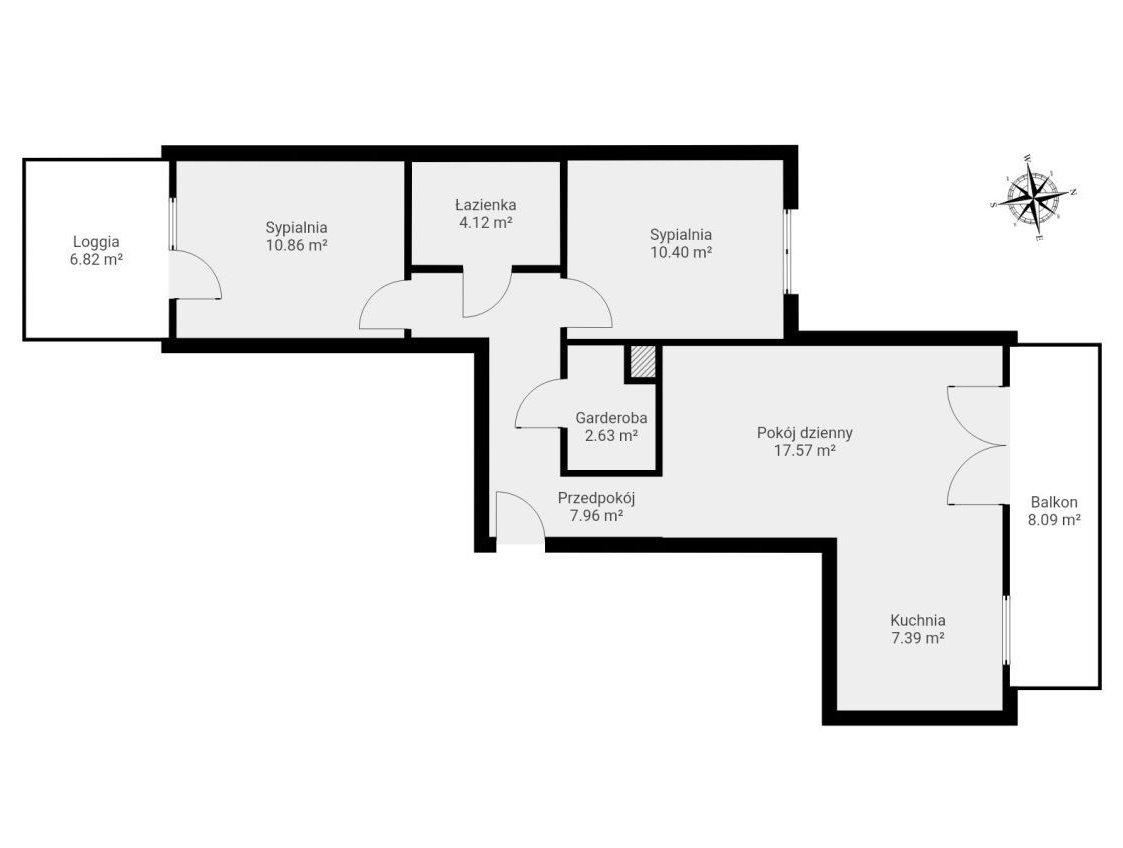 - przestronny pokój dzienny (17,57 m²) z wyjściem na balkon (8,09 m²),