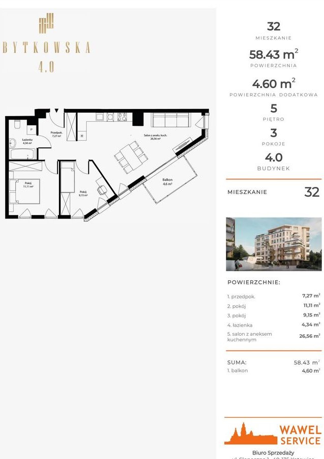 3-pokojowe mieszkanie numer 32 na 5. piętrze w Inwestycji Bytkowska 4.0 Dewelopera Wawel Service