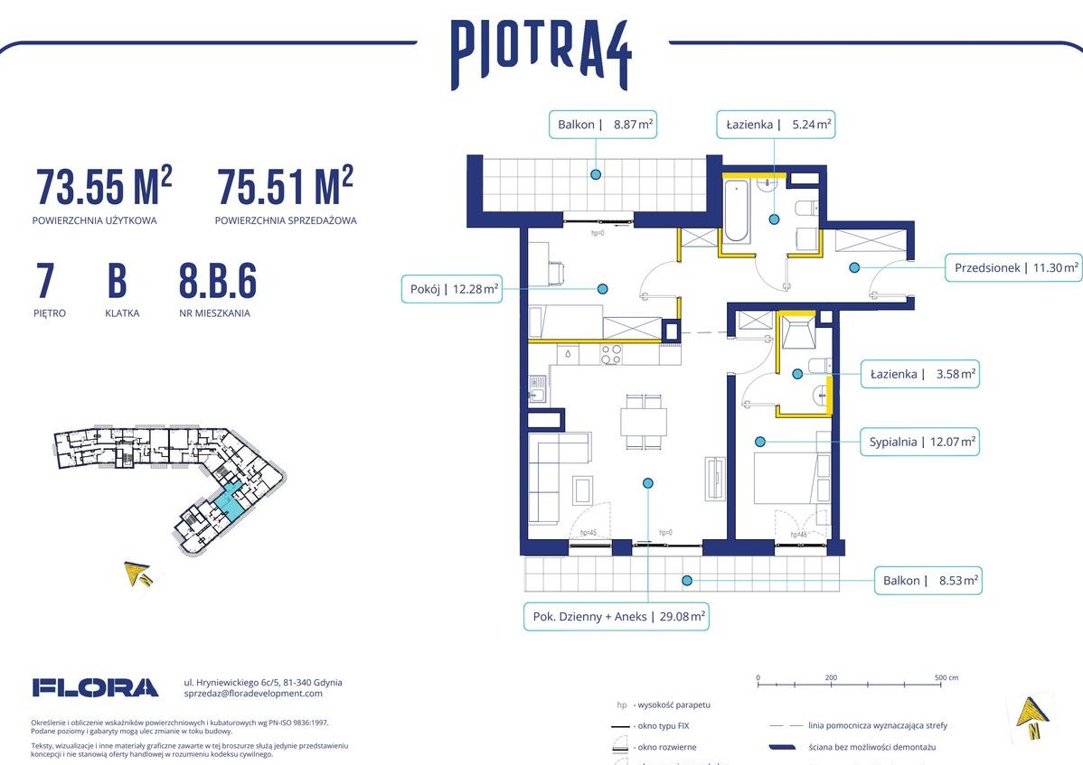 3-pokojowe mieszkanie numer 8.B.6 na 7. piętrze w budynku B w Inwestycji Piotra 4 Dewelopera Flora Development