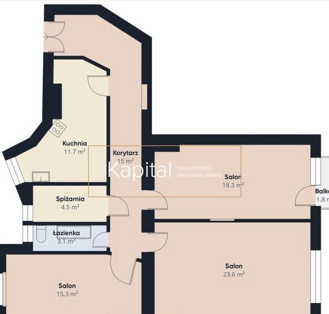 Układ: 3 przestronne pokoje, spiżarnia, osobna kuchnia, łazienka, balkon, piwnica