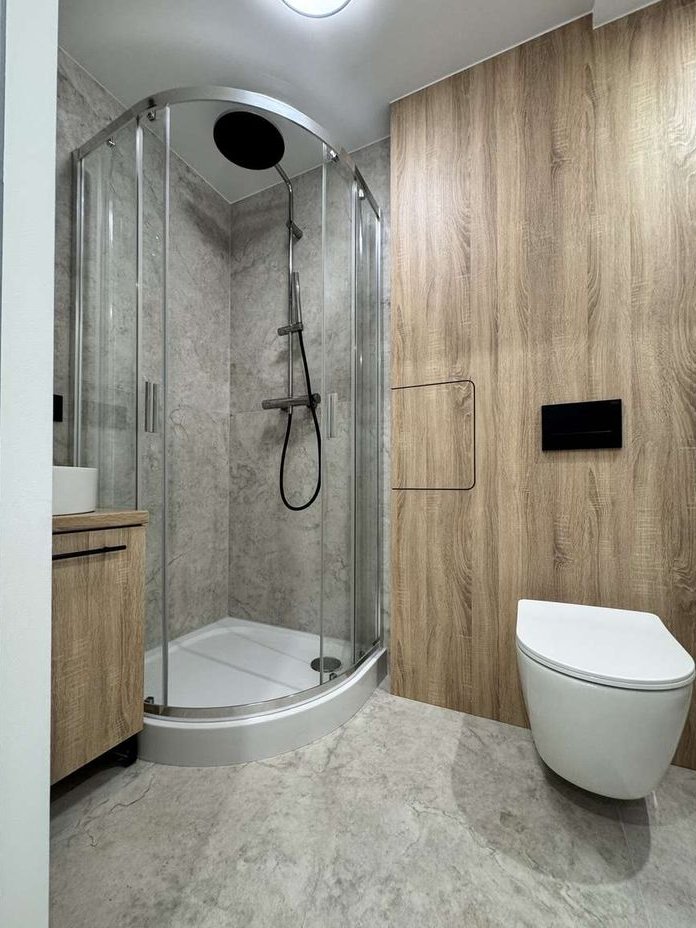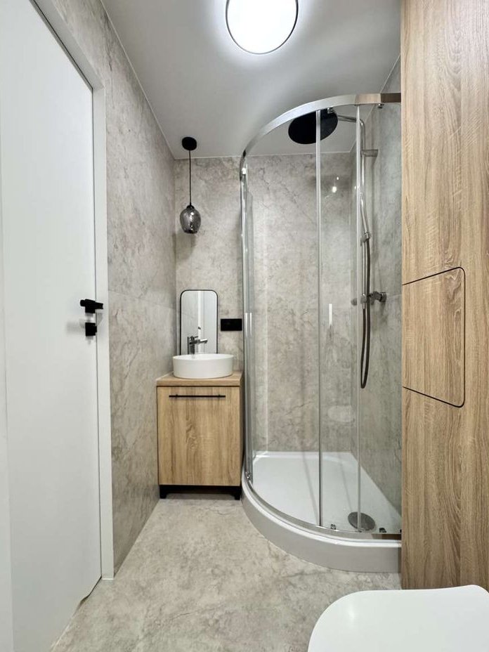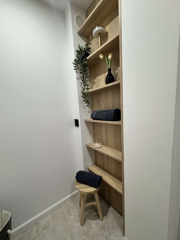 łazienka z prysznicem z miejscem na pralkę oraz na przechowywanie,