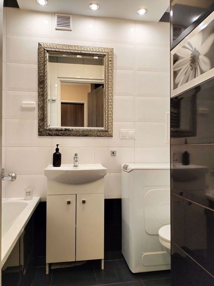 W łazience wanna, toaleta, umywalka z szafką oraz pralka.