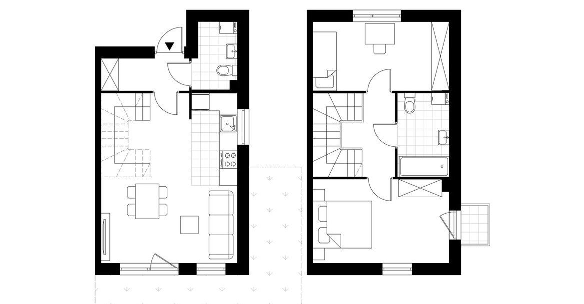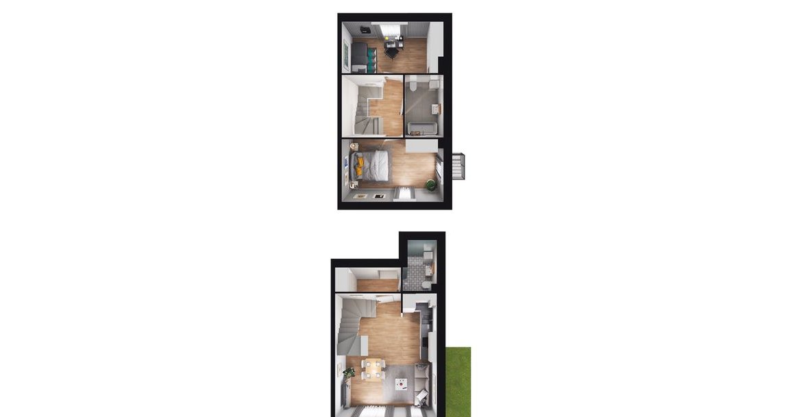 Na parterze znajduje się przestronny salon z aneksem kuchennym oraz wyjściem do ogrodu. Dodatkowe WC dla gości i schowki na narzędzia w wybranych domach podnoszą funkcjonalność. Na piętrze mieszczą się 2 lub 3 pokoje oraz łazienka, a wschodnio-zachodnia ekspozycja gwarantuje optymalne nasłonecznienie przez cały dzień.