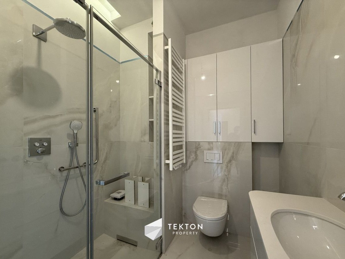 Przestronny salon posiada wyjście na dużą loggię, która stanowi dodatkową strefę wypoczynkową. Ponadstandardowa wysokość pomieszczeń, wynosząca około 3,05 m, potęguje poczucie przestrzeni i światła. Mieszkanie zostało wykończone w wysokim standardzie, a zabudowane szafy i praktyczne rozwiązania do przechowywania zwiększają jego funkcjonalność. Apartament jest częściowo umeblowany i gotowy do własnej aranżacji.