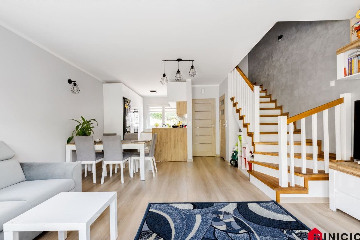 Na parterze znajduję się salon z wyjściem na taras, jadalnia, aneks kuchenny, wiatrołap oraz WC, wejście na piętro schodami jesionowymi wykonanymi pod wymiar. Na piętrzę trzy sypialnie, łazienka z oknem.