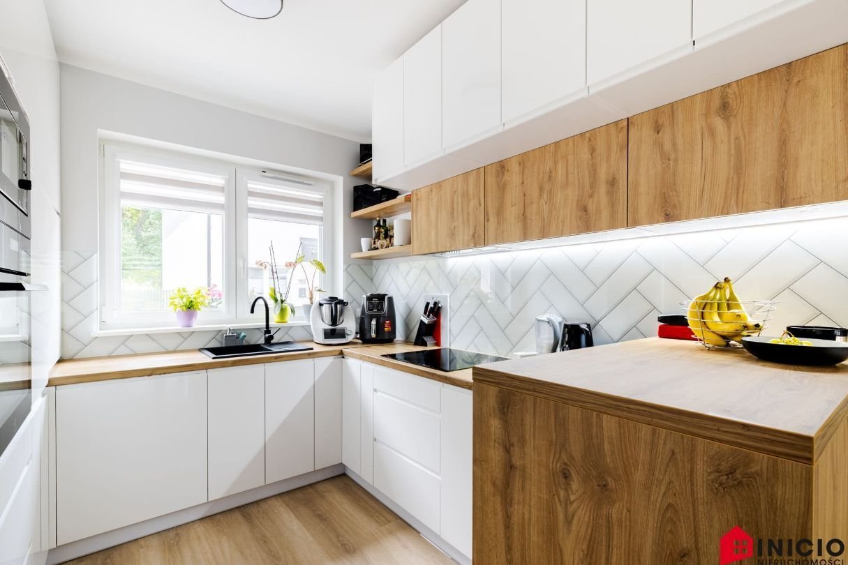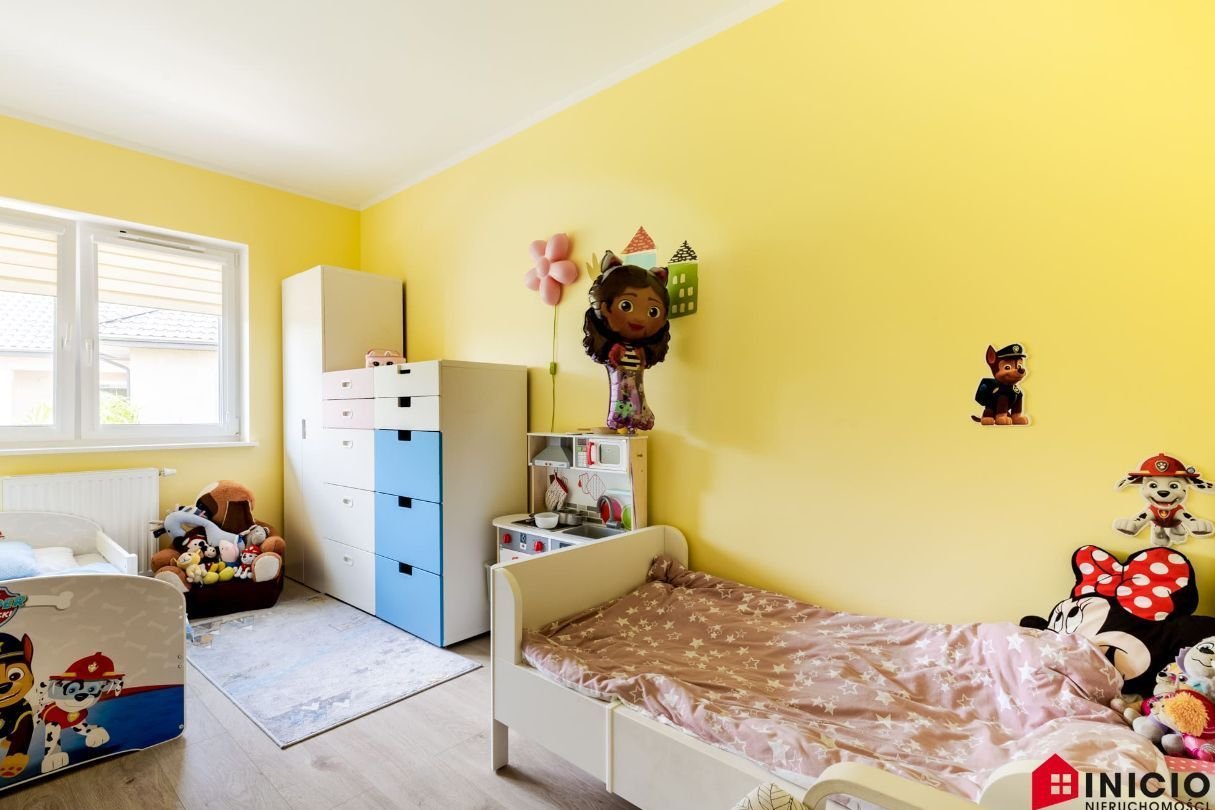 Ściany wygładzone, pomalowane w kolorze, w salonie jedna ze ścian wykonana w farbie strukturalnej. Na parterze podłoga winylowa, w łazience i wiatrołapie terakota, w pozostałych pomieszczeniach panele.