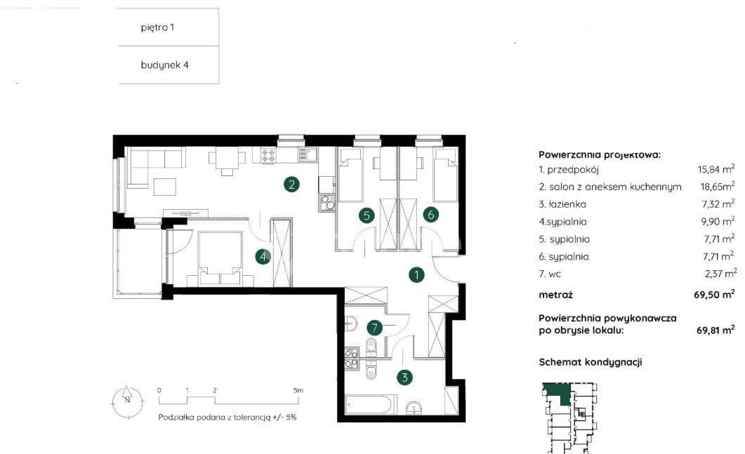 Apartament 3B108 o powierzchni 69,81 m 2, znajduje się na 1 piętrze, nowoczesnego budynku z windą na który składa się: