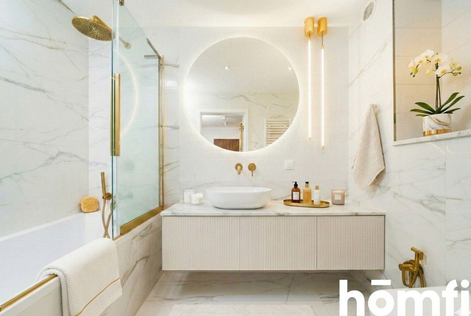 ✔ wykończono częściowo łazienkę (płytki, wanna, WC, złota armatura, lustro z oświetleniem)