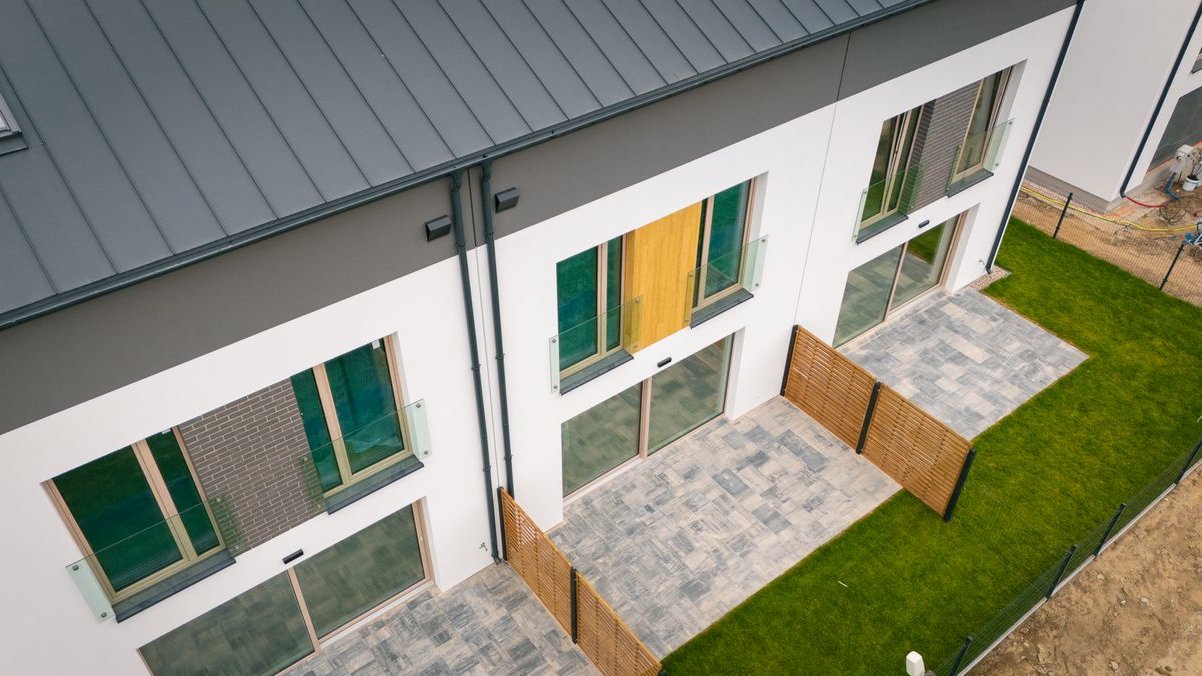 Estetyczna elewacja z elementami drewnopodobnymi, stolarka okienna kolor polareiche/antracyt;
