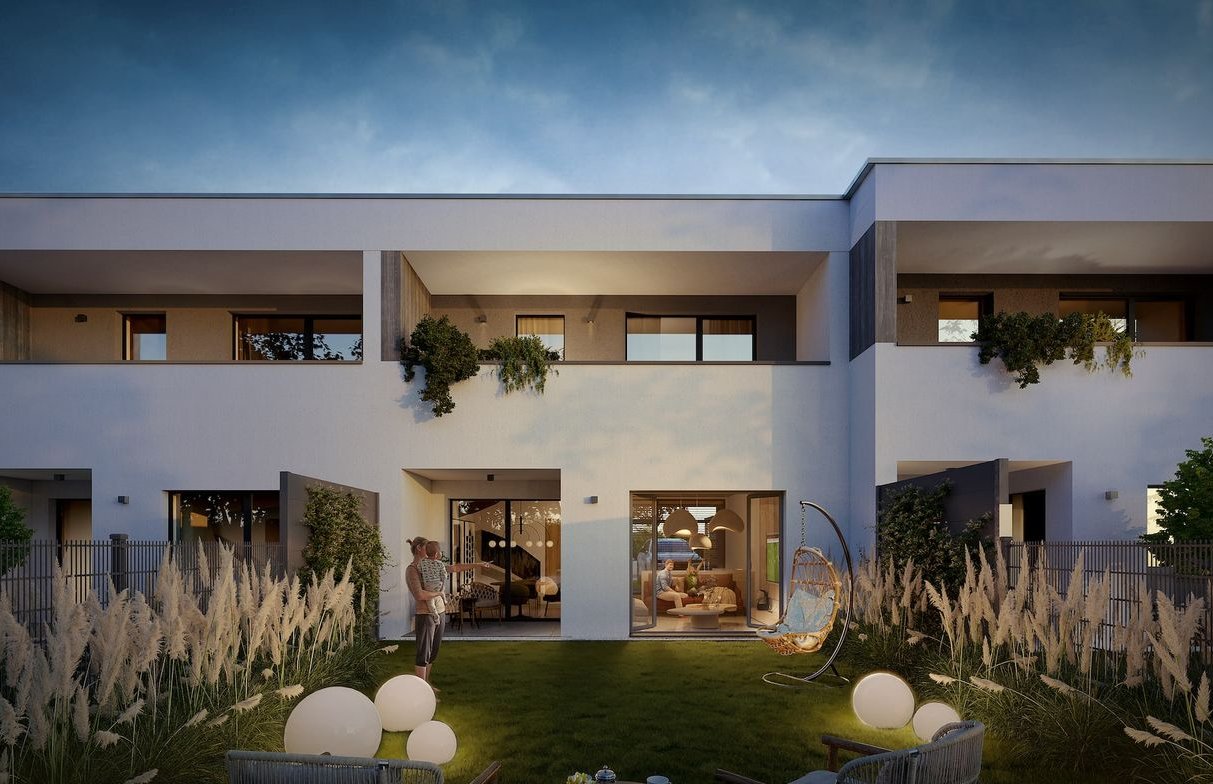 Aktualnie dostępne są ostatnie gotowe do odbioru nieruchomości – mieszkania dwupoziomowe w domach dwulokalowych oraz domy szeregowe.