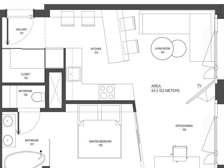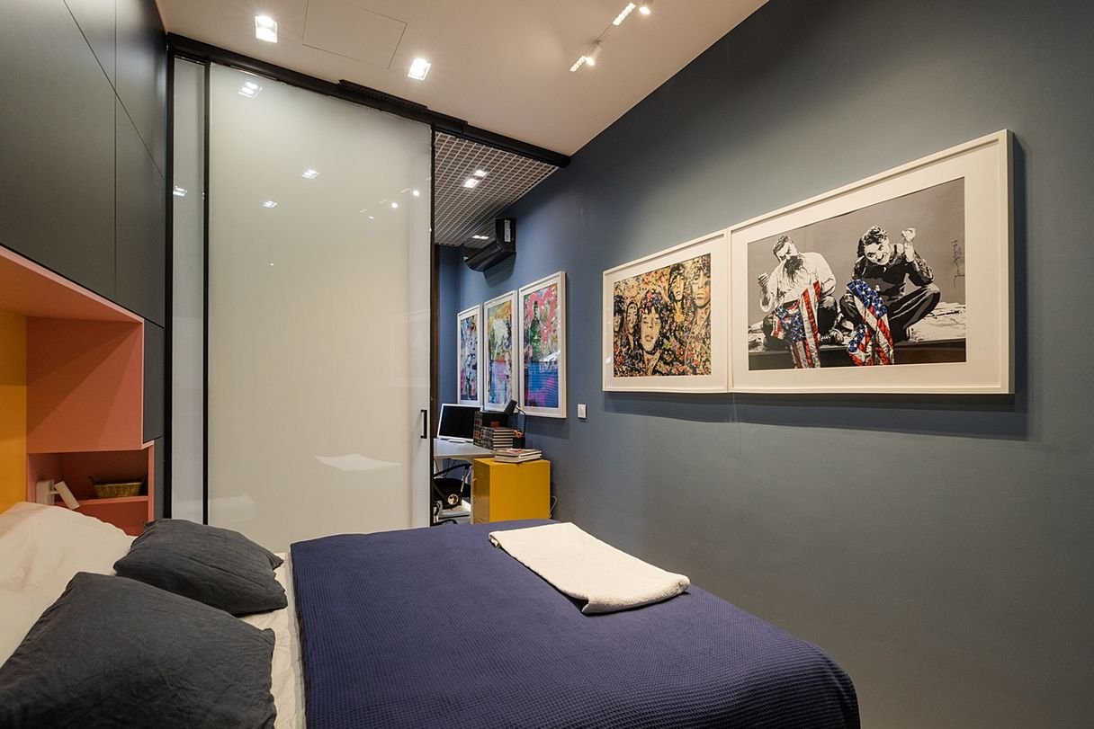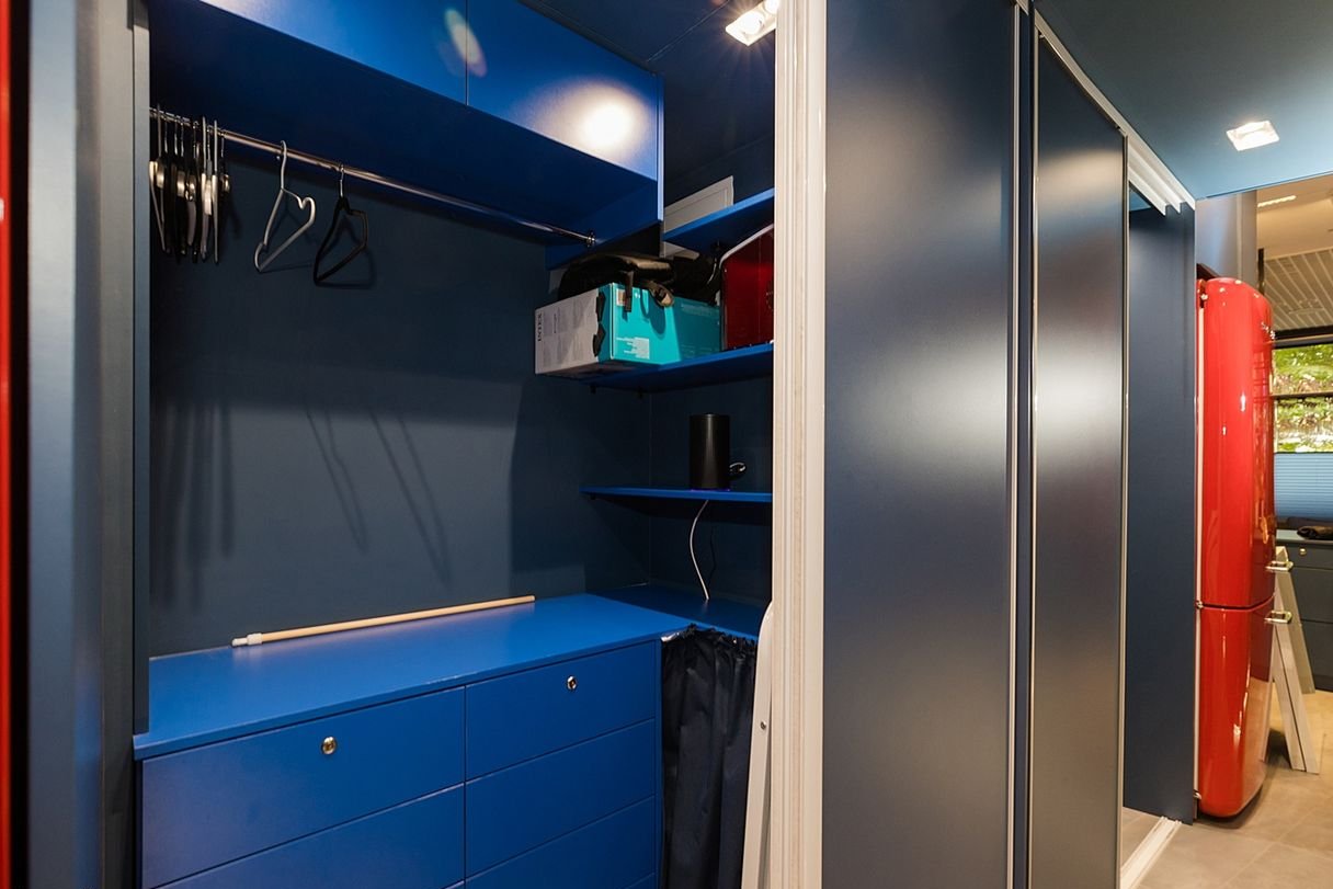 Szklana sypialnia, przestronny salon, elegancka łazienka z wanną, zabudowy stolarskie i mnóstwo miejsca do przechowywania.