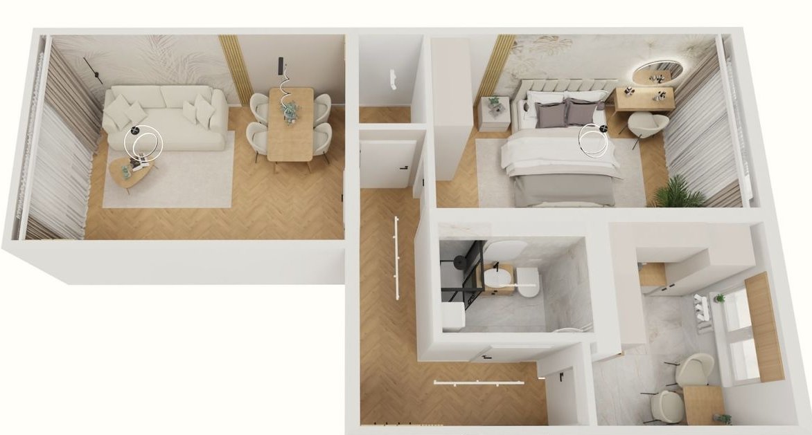 Mieszkanie zostanie wykończone w jasnym, nowoczesnym stylu, zgodnie z załączonymi wizualizacjami (wizualizacje przedstawiają planowany efekt końcowy).
