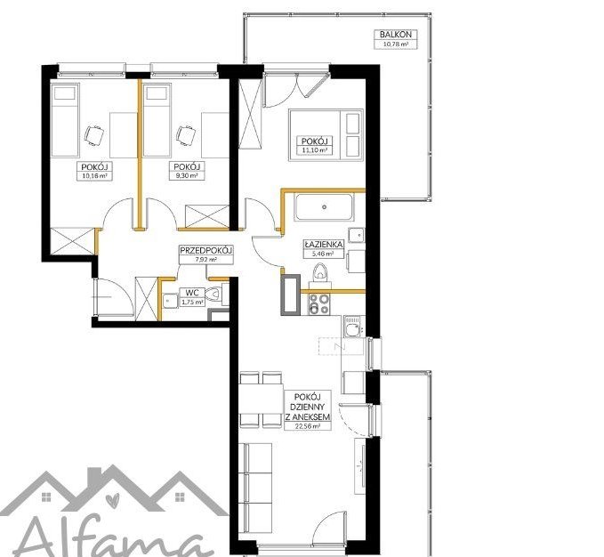 Mieszkanie składa się z przestronnego salonu z aneksem kuchennym, 3 sypialni, ustawnego przedpokoju, dużej łazienki, wc oraz dodatkowo 2 dużych,narożnych balkonów (11 i 12 m2).