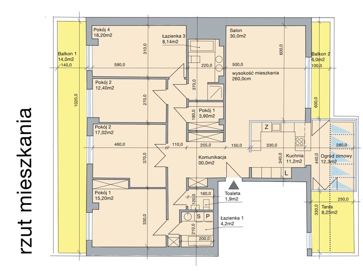 czterech sypialni: 18,20 m², 12,40 m², 17,02 m², 15,20 m², z trzech wyjście na balkon o powierzchni 14 m²