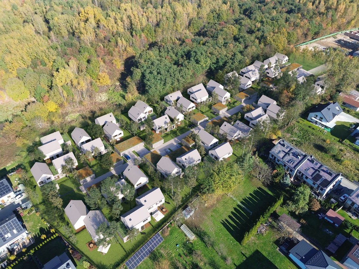 Nietypowe układy budynków oraz ich wzajemne, nieregularne położenie tworzy naturalny układ – stworzona została struktura, która wpasowała się w istniejący krajobraz i uwarunkowania przyrodnicze. Dzięki temu osiedle zyskuje bardziej złożony rytm przestrzenny, lepsze wkomponowanie w otoczenie oraz większy komfort użytkowników, przy jednoczesnym utrzymaniu spójnej estetyki całej zabudowy. Perspektywa ciągle się zmienia – zamiast jednego osiowego widoku są krótkie kadry, w których domy co chwilę „zasłaniają” i „odkrywają” kolejne fragmenty zieleni.