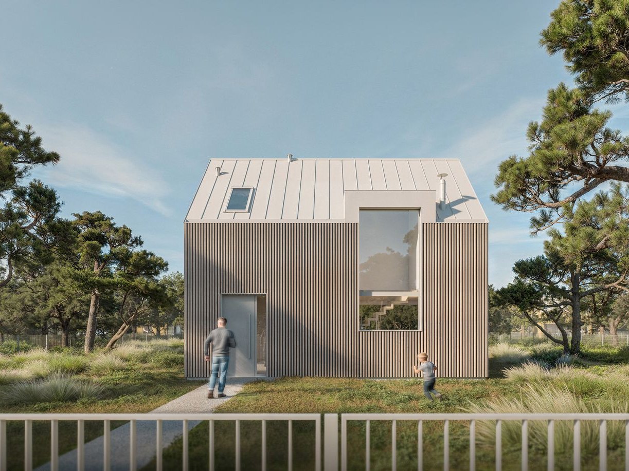 Design: Elewacja z drewna opalanego, cegły lub betonu. Dach dwuspadowy, stolarka aluminiowa premium.