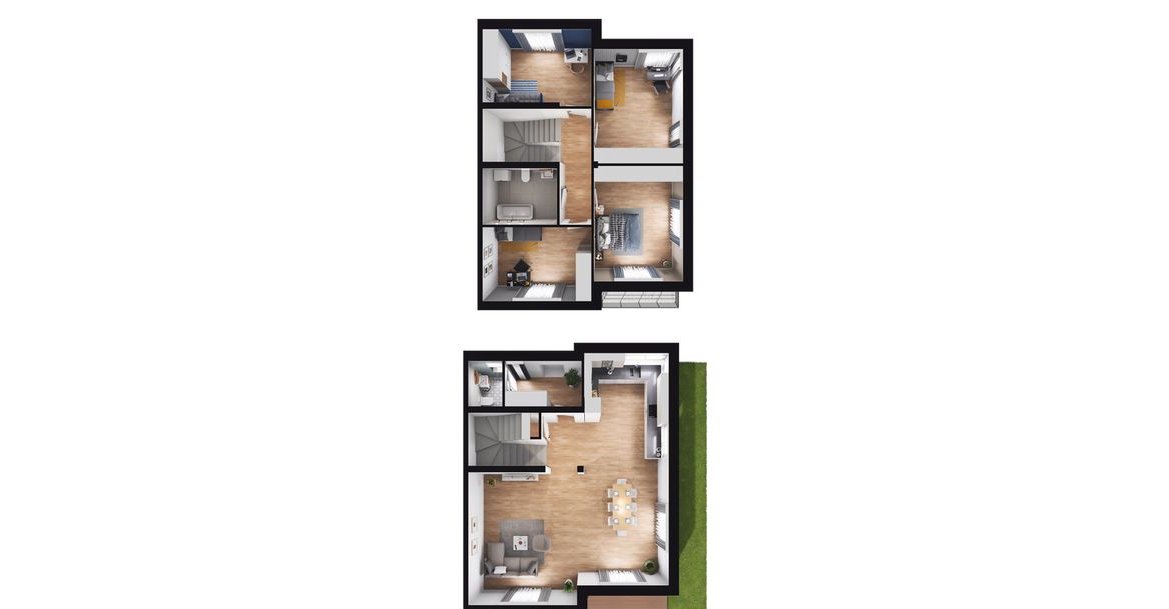 segment skrajny o metrażu 123,02 mkw. (salon, 4 sypialnie, poddasze 53,5 mkw. po podłodze) + ogród 126-169 mkw.