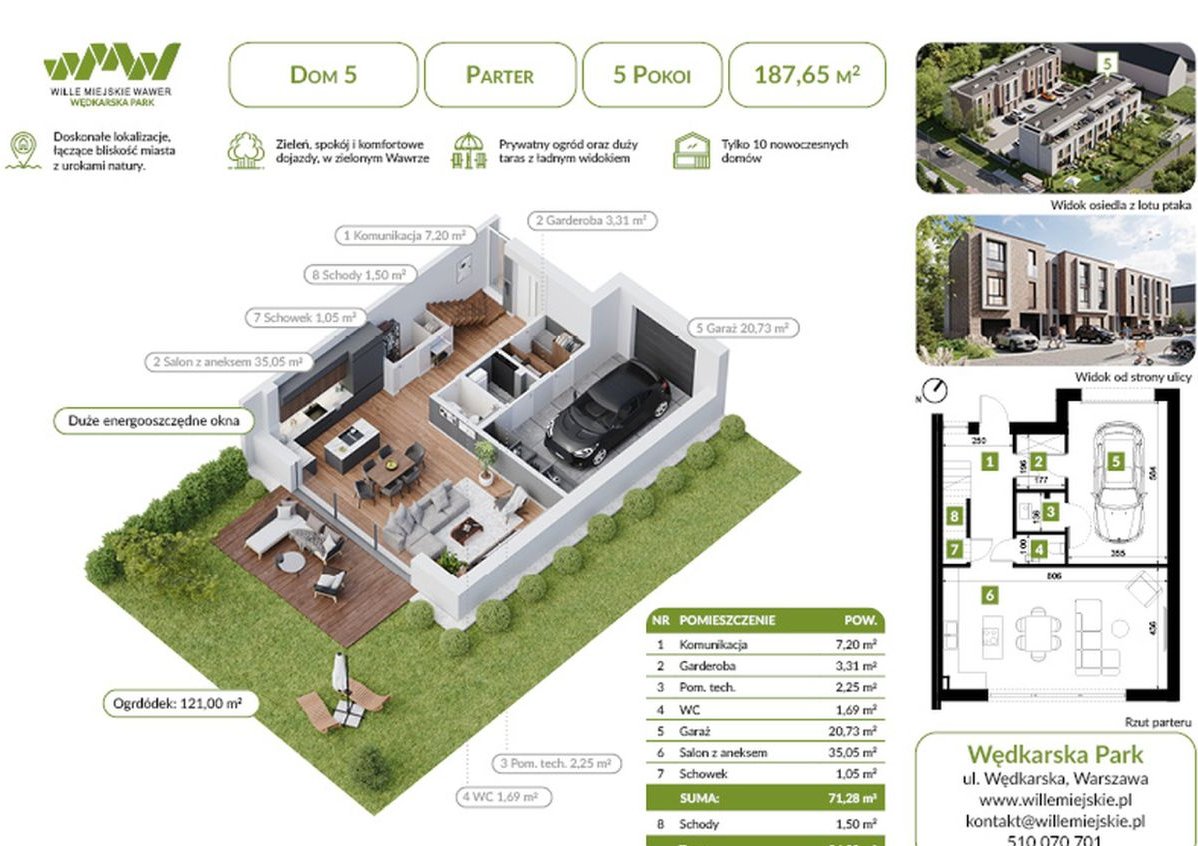 Wędkarska Park to domy w zabudowie szeregowej składające się z 10 lokali. Inwestycja znajduje się w Wawrze, blisko najważniejszych punktów komunikacyjnych, rekreacyjnych i handlowo-usługowych. Obok inwestycji mieści się przystanek autobusowy, umożliwiający szybkie połączenie z pozostałymi częściami miasta. W 5 minut rowerem można dotrzeć do Plaży Romantycznej nad Wisłą. Z kolei większe zakupy można zrobić w centrum handlowym Ferio Wawer, do którego dojedzie się w ok. 10 minut samochodem.