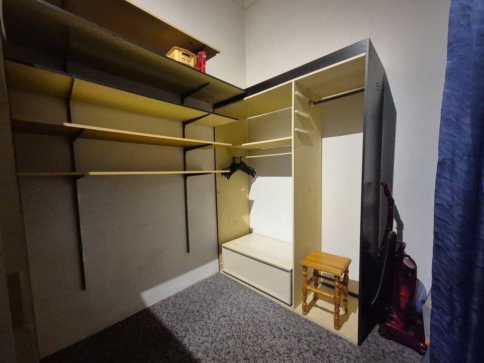 drugi pokój z przesuwnymi lustrzanymi drzwiami, wyposażony w garderobę z półkami i drążkami,