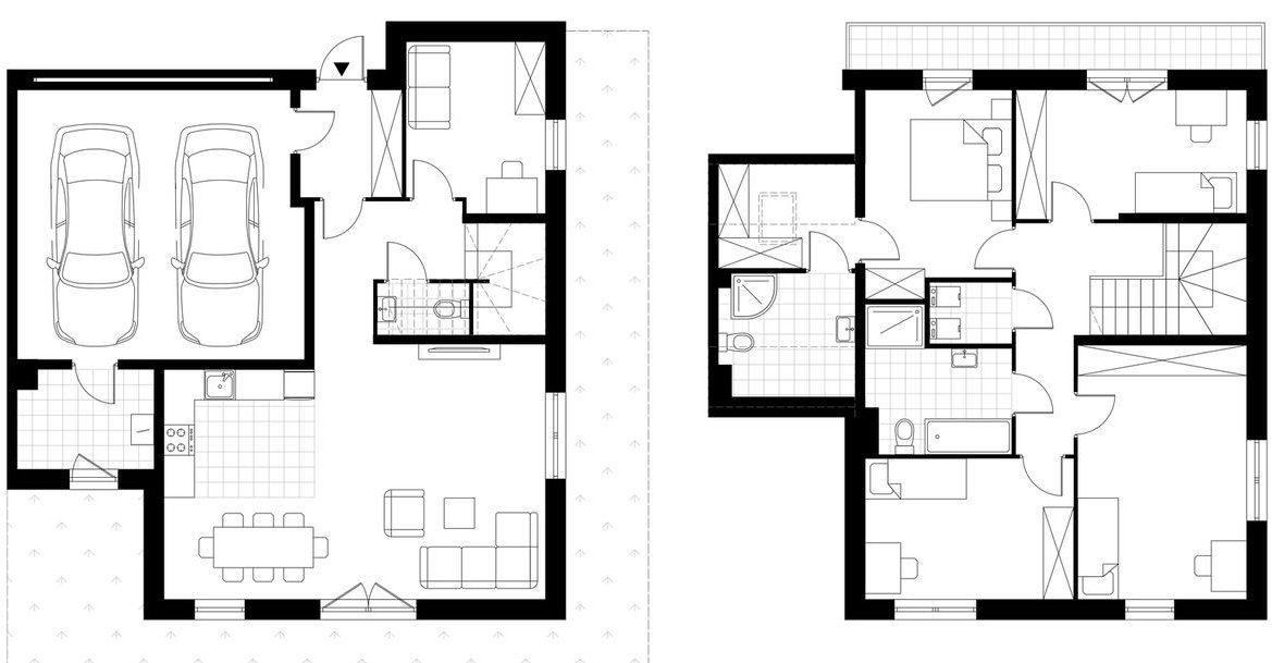 Każdy dom posiada garaż dwustanowiskowy i 2 miejsca postojowe przed posesją