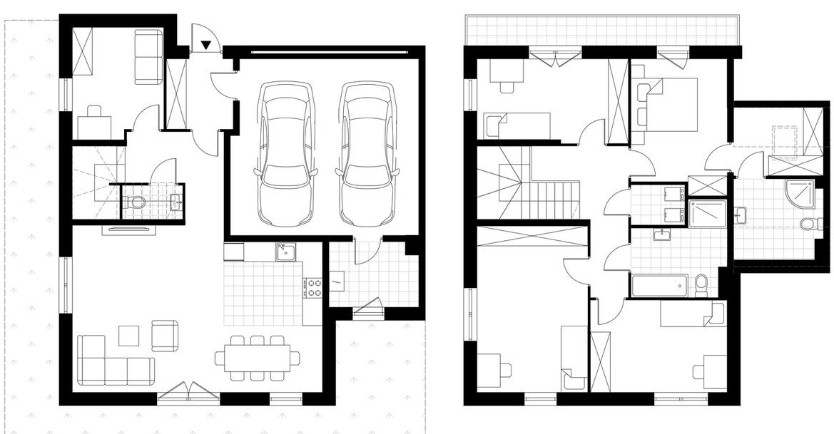 Każdy dom posiada garaż dwustanowiskowy i 2 miejsca postojowe przed posesją