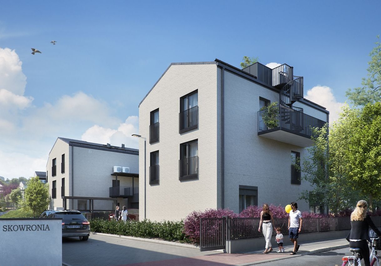 Skowronia to kameralne osiedle 12 energooszczędnych domów w zabudowie bliźniaczej. Każdy budynek został podzielony na dwa, dwupoziomowe apartamenty o powierzchniach od 127 m² do 143 m²(łącznie 24 mieszkania). Do każdego apartamentu przynależy garaż o powierzchni ok. 20 m². Cena całościowa mieszkania zawiera cenę zakupu garażu.
