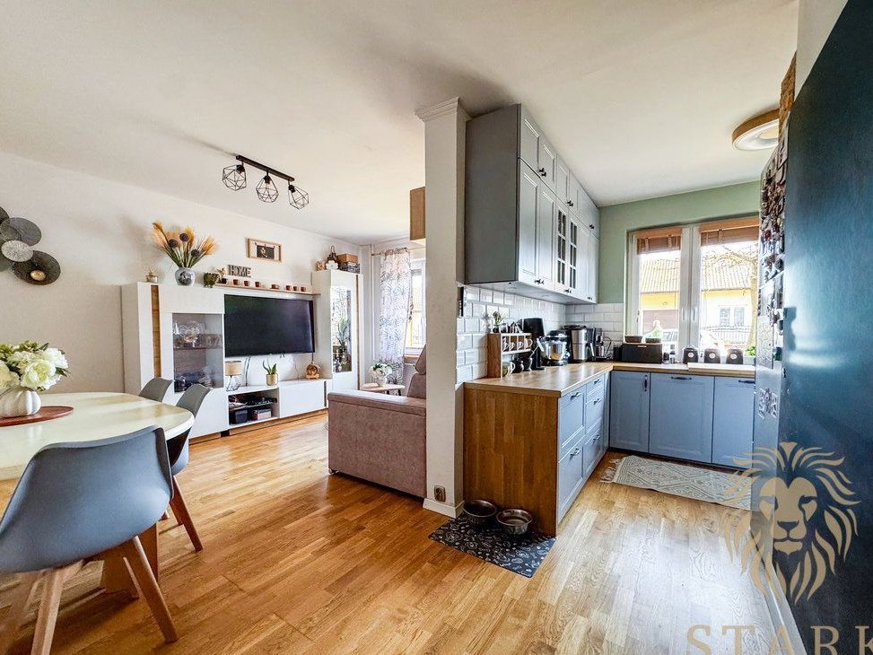 Salon połączony z funkcjonalną, półotwarta kuchnią.
