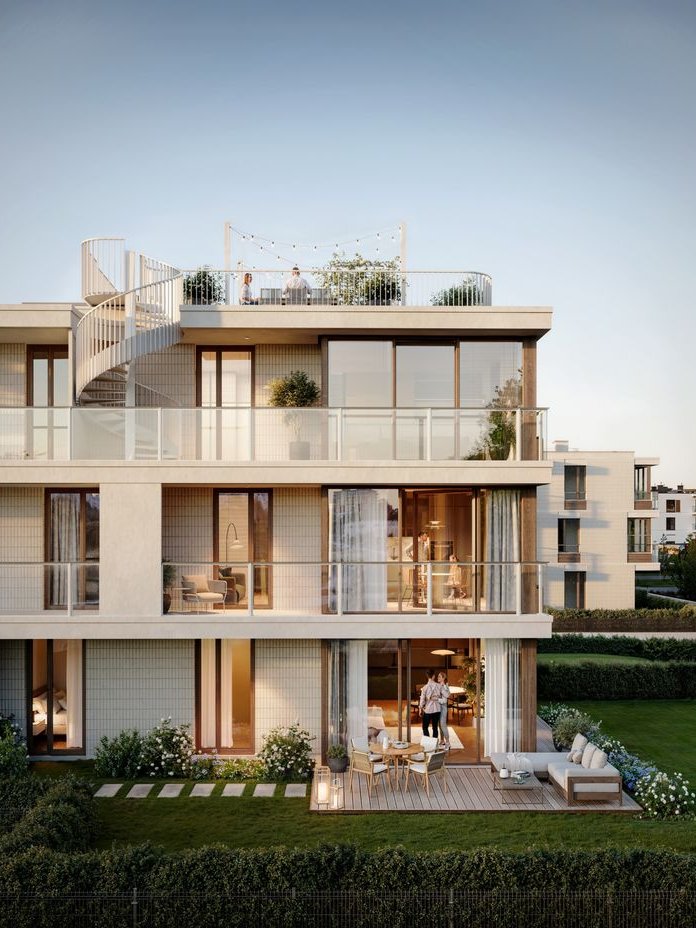 Projekt architektoniczny osiedla wyróżnia się eleganckimi detalami: ceramicznymi płytkami na fasadach i dużymi, drewnianymi oknami. Lokale wyposażone są w przestronne tarasy i ogródki, tworzące doskonałą przestrzeń do relaksu.