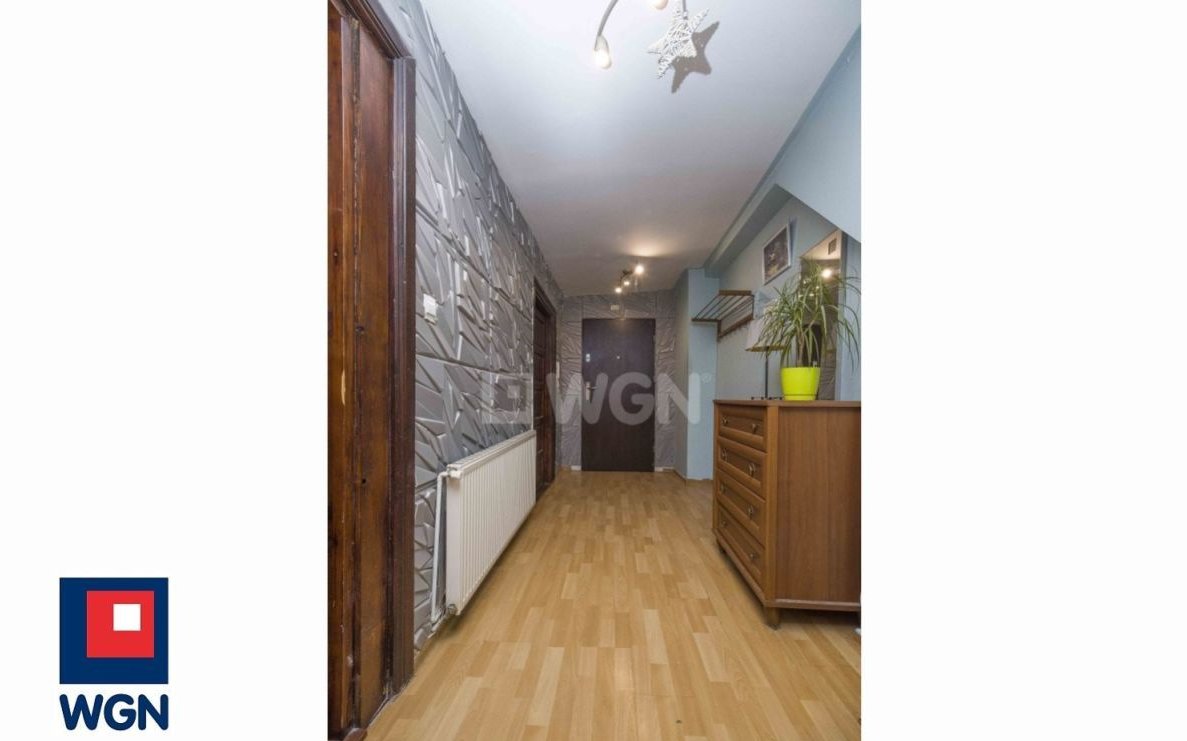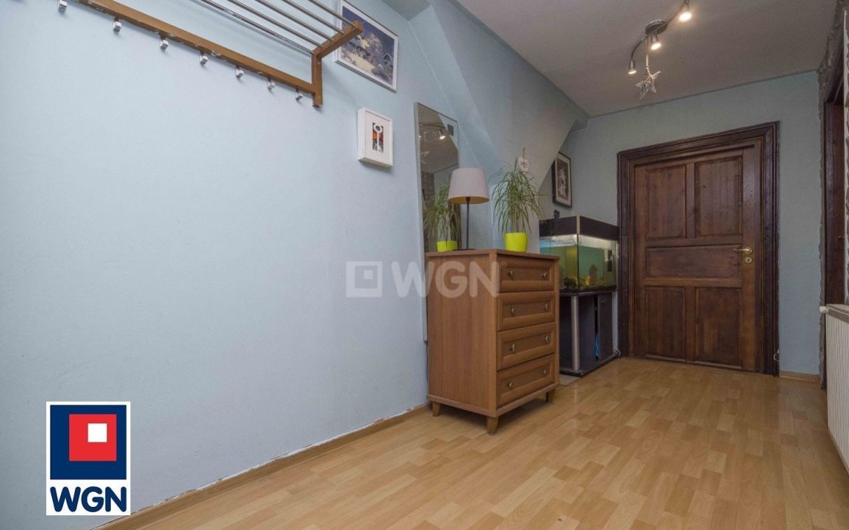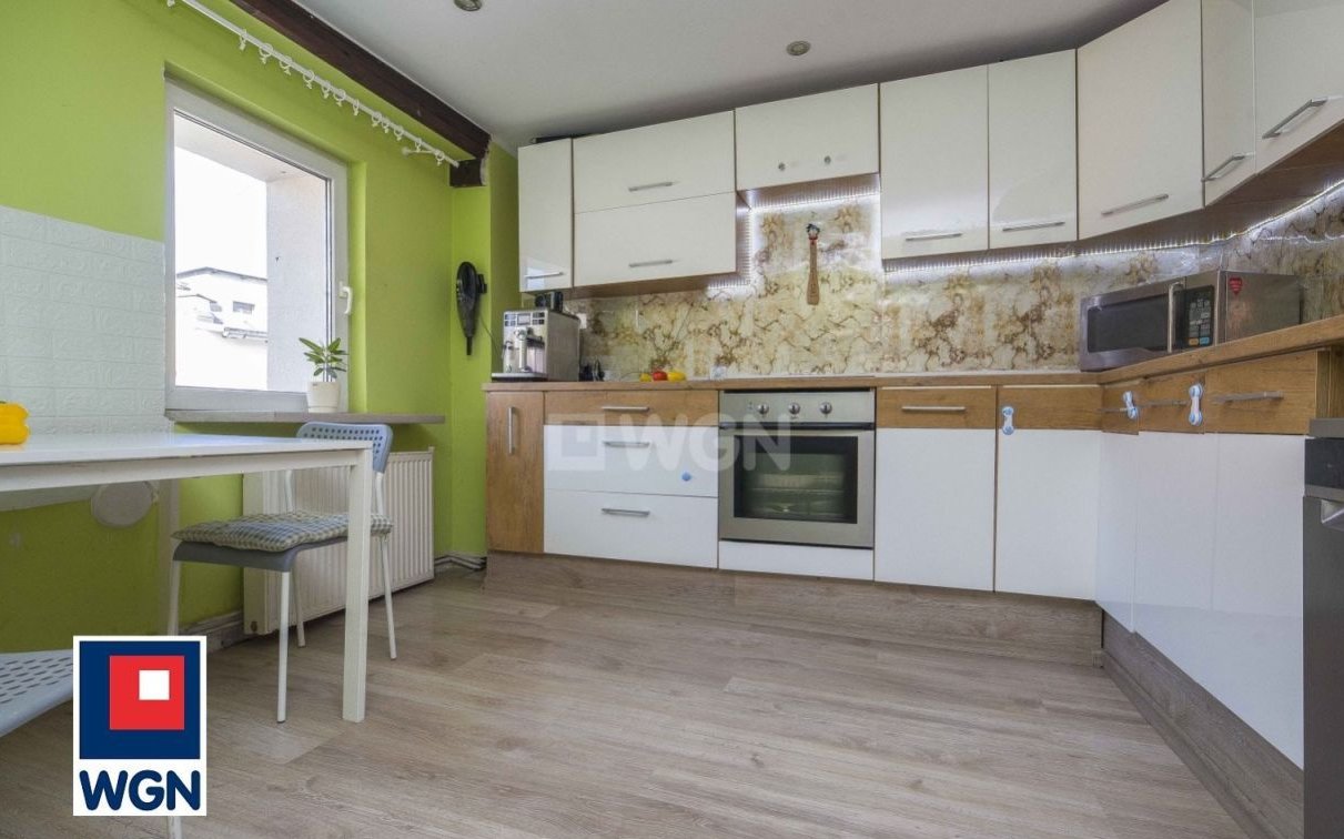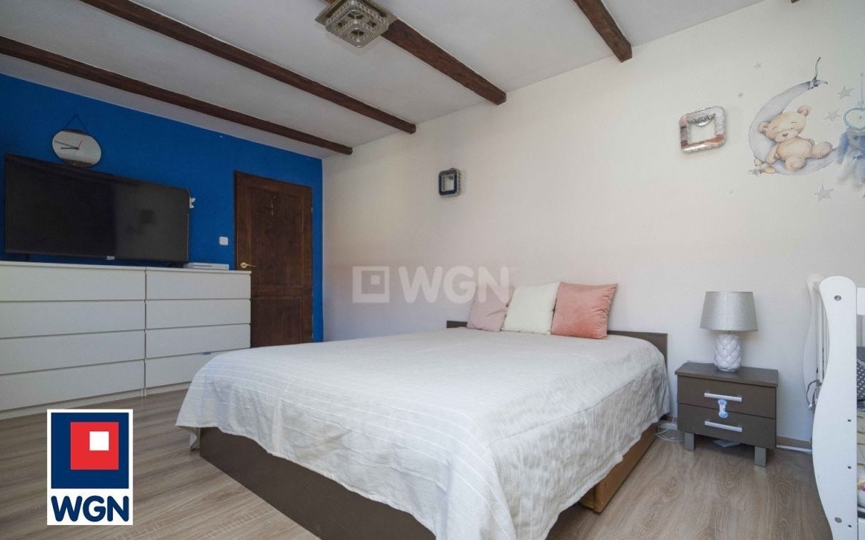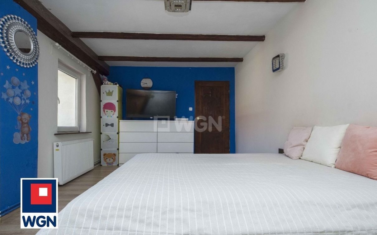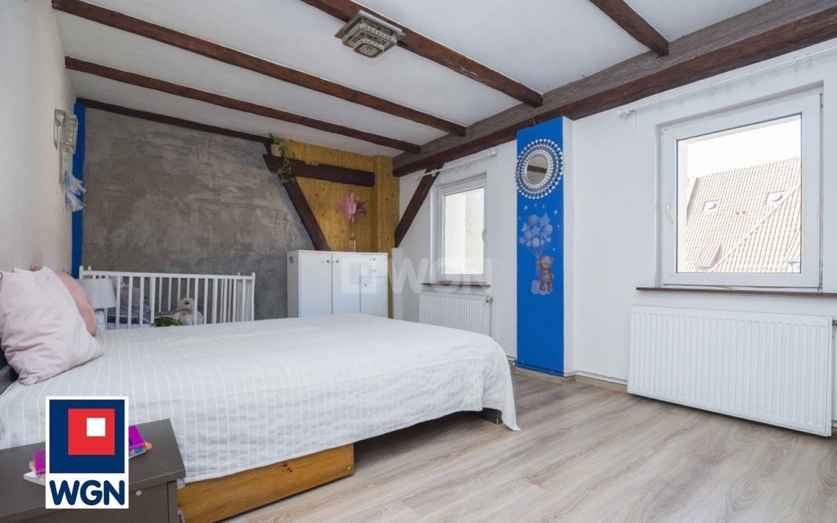 Lokal mieszkalny daje duże możliwości aranżacyjne. Pokoje przestronne, ściany w gładzi i tapecie, na podłogach panele i płytki. Jedno z pomieszczeń obecnie zaaranżowane jako trzeci pokój. Mieszkaniu nadają charakter oryginalne belki widoczne na zdjęciach, a także zabudowany w salonie kominek dbający o klimat w długie zimowe wieczory. Okna PCV.