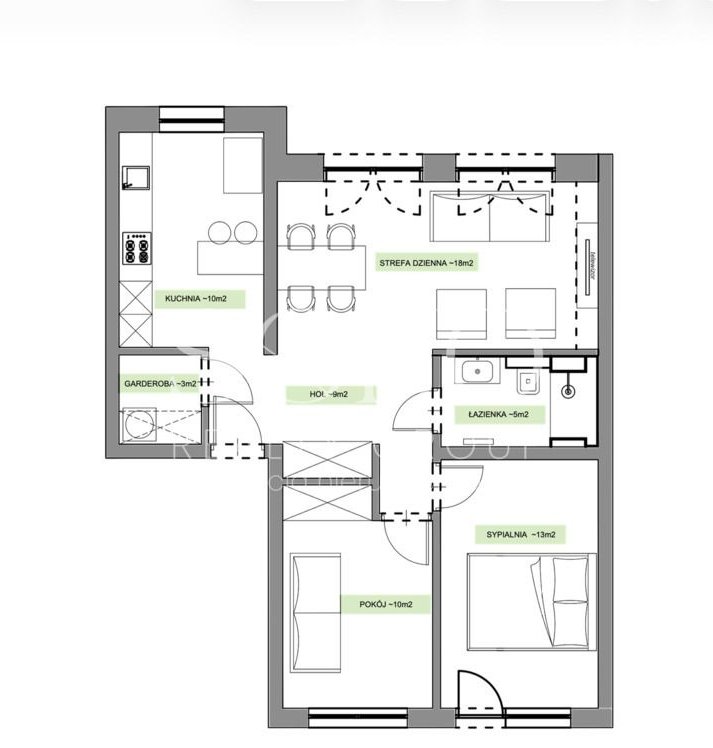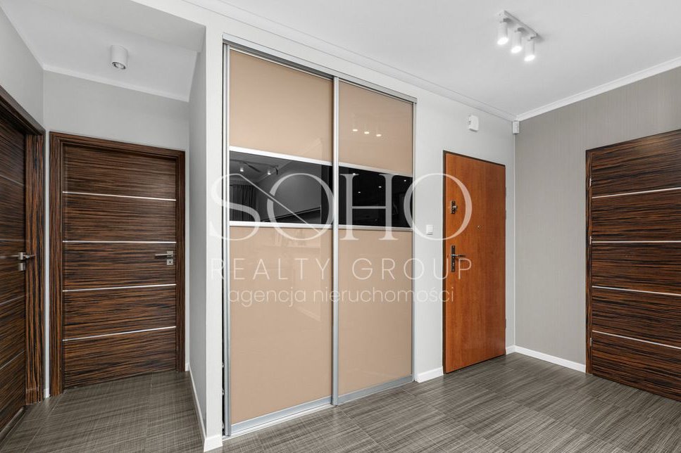 Mieszkanie składa się z: salonu, osobnej kuchni, dwóch osobnych sypialni, łazienki, garderoby z pralnią, przedpokoju.