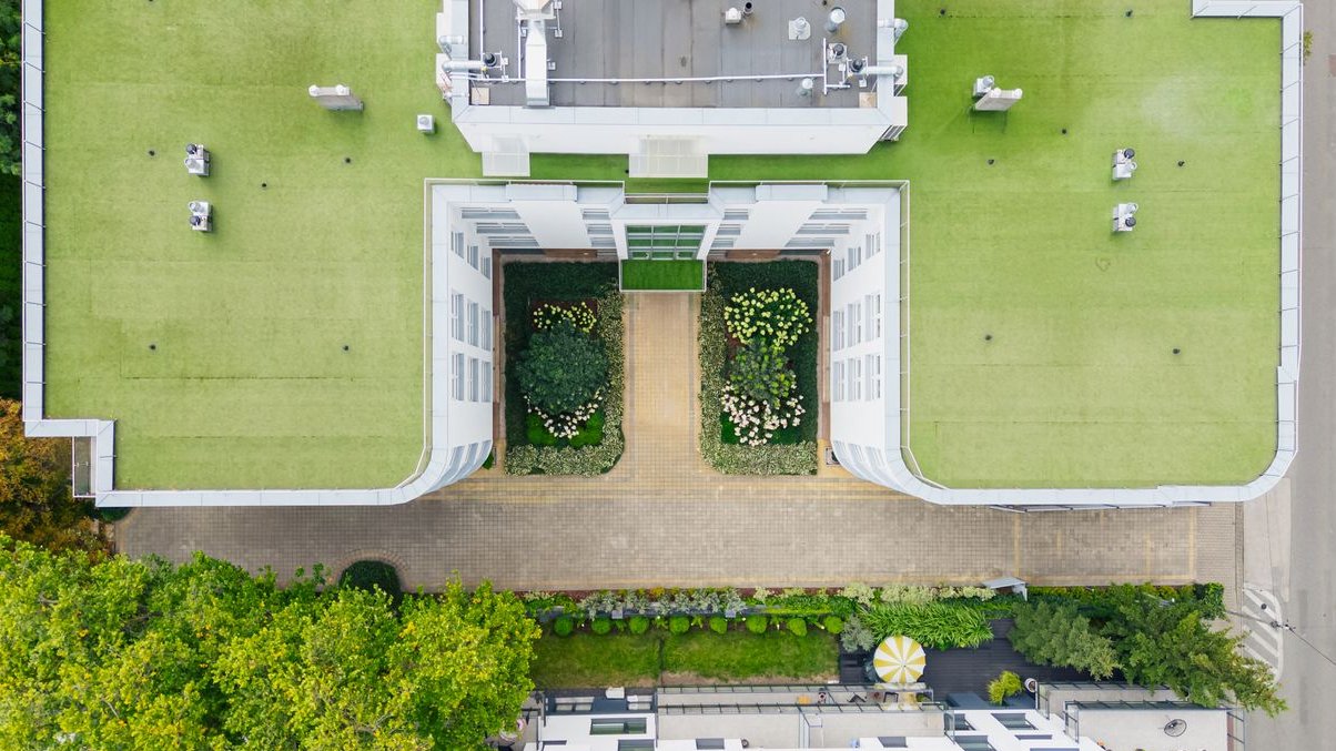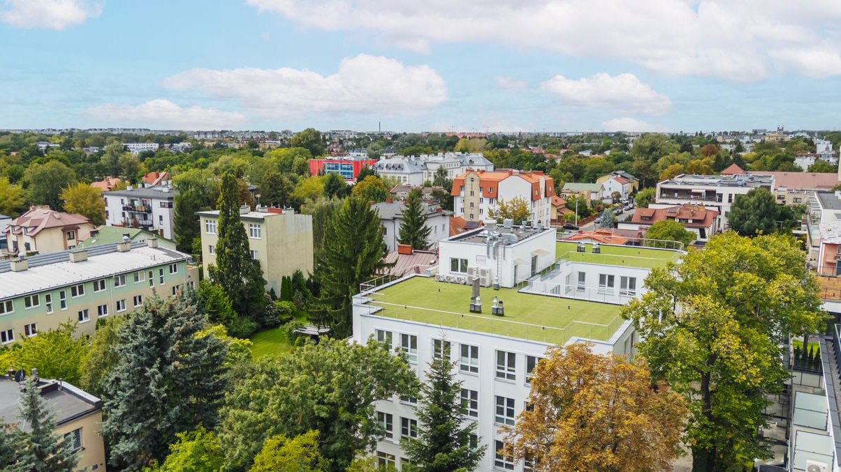 - Zielony taras na dachu z widokiem na panoramę Warszawy dla mieszkańców