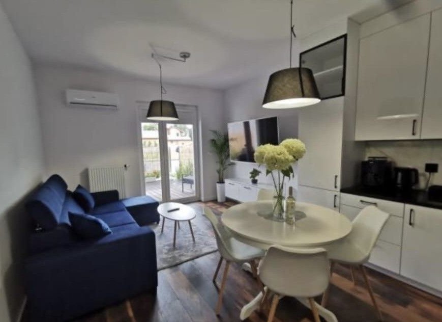 Apartament został starannie wyremontowany i wykończony z dbałością o detale. Jasna, ponadczasowa kolorystyka oraz duże przeszklenia tworzą przestrzeń pełną światła i harmonii. Salon płynnie łączy się z ogrodem, stanowiąc naturalne przedłużenie strefy dziennej.