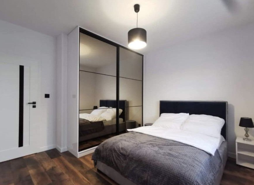Dwie komfortowe sypialnie zostały wyposażone w wygodne łóżka oraz pojemne, zabudowane szafy, zapewniające maksymalną funkcjonalność i estetykę wnętrza. Łazienka urządzona w nowoczesnym standardzie podkreśla wysoki charakter nieruchomości.