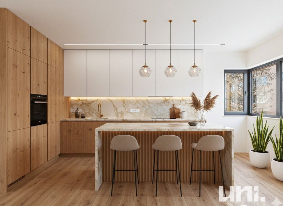 a huge, bright living room with a kitchenette – the heart of the apartment, perfect for spending time together,