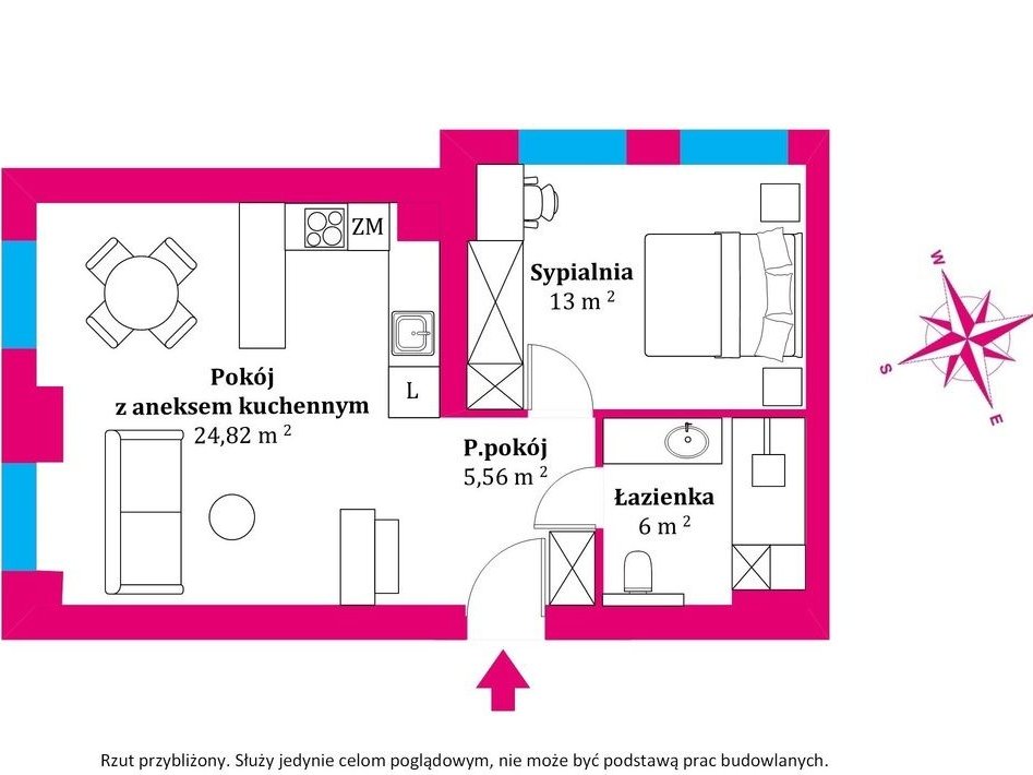 Apartament składa się z przestronnego salonu z aneksem kuchennym (24,8 m²), wygodnej sypialni (13 m²) oraz nowoczesnej łazienki (6 m²). Każde pomieszczenie zostało starannie zaprojektowane, z dbałością o detale i funkcjonalność. Mieszkanie jest gotowe do wprowadzenia – nie wymaga żadnych nakładów.