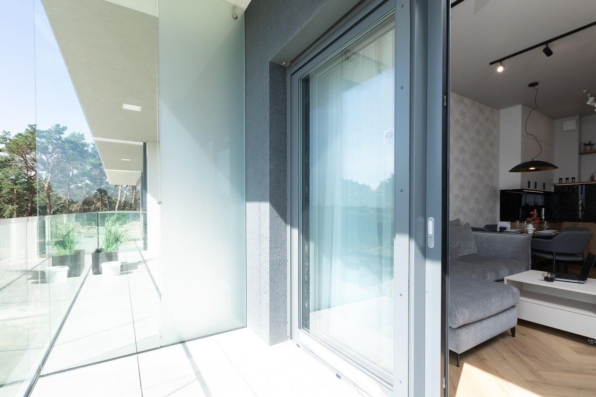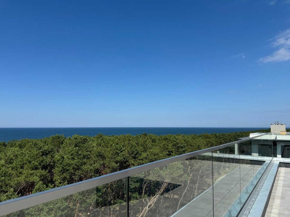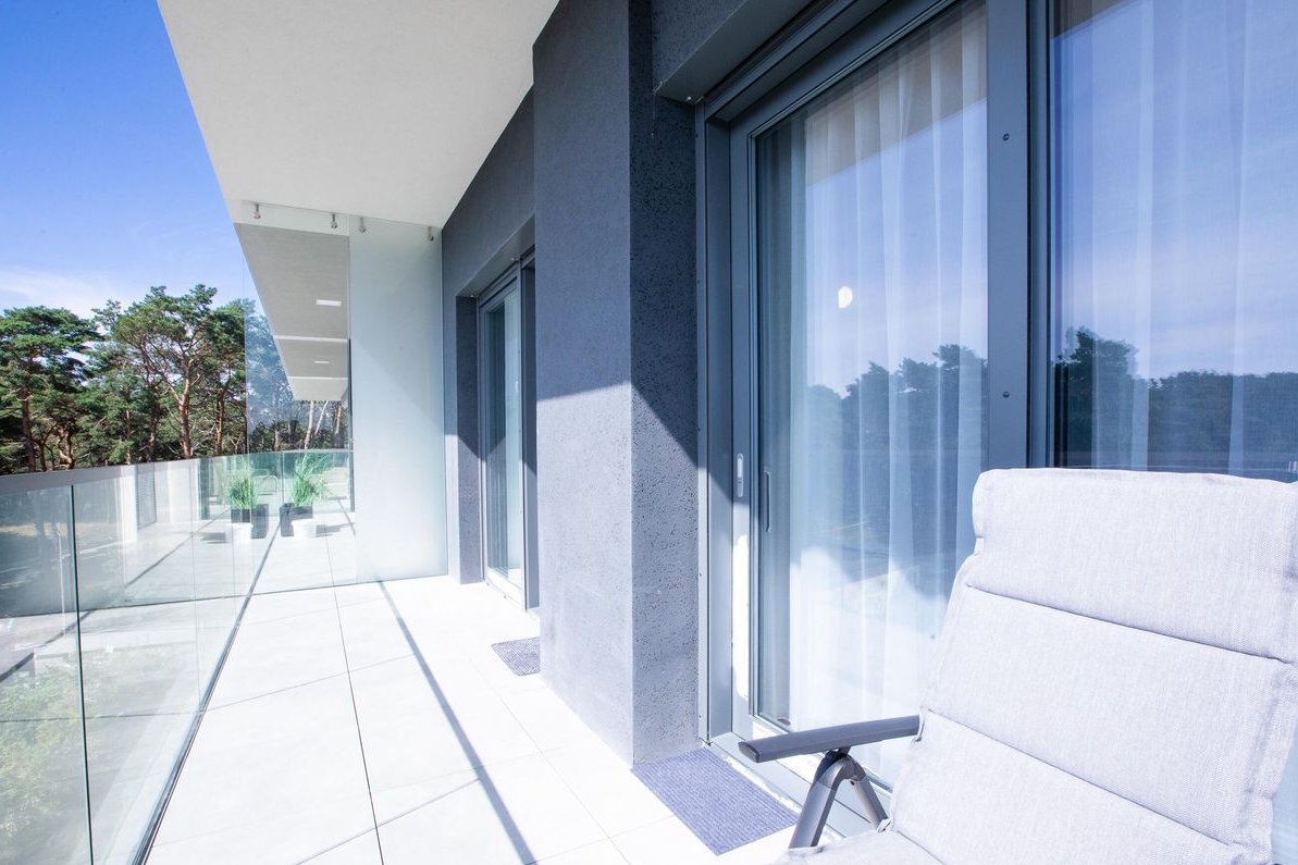 PRESTIŻOWY LOKAL APARTAMENTOWY dwupokojowy w pierwszej linii brzegowej z bocznym widokiem na las nadmorski i wydmy zaprojektowany i urządzony w nowoczesnym stylu z imponującym tarasem ze szklaną balustradą.