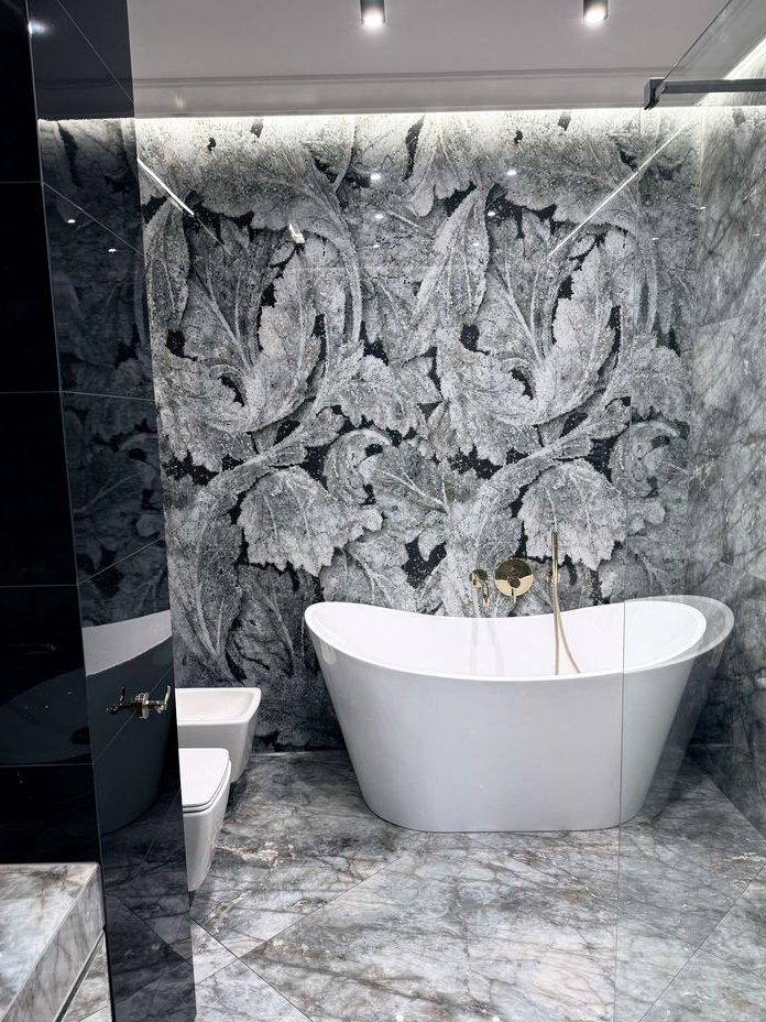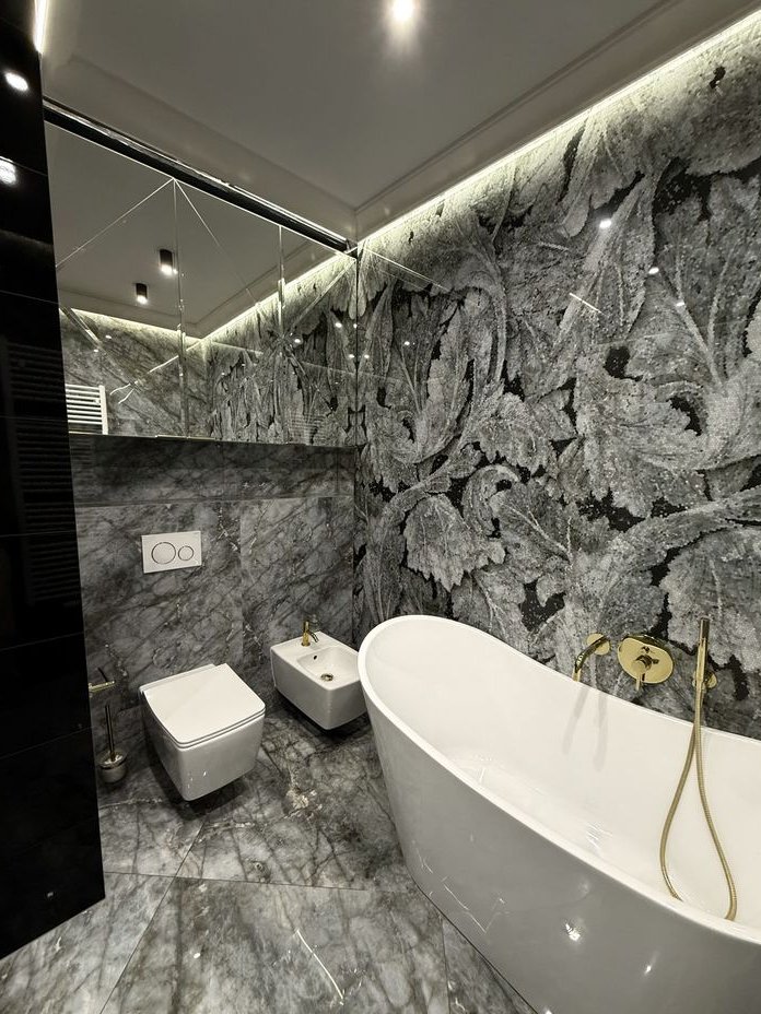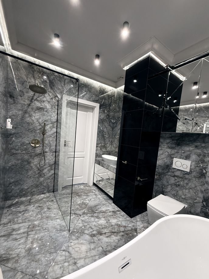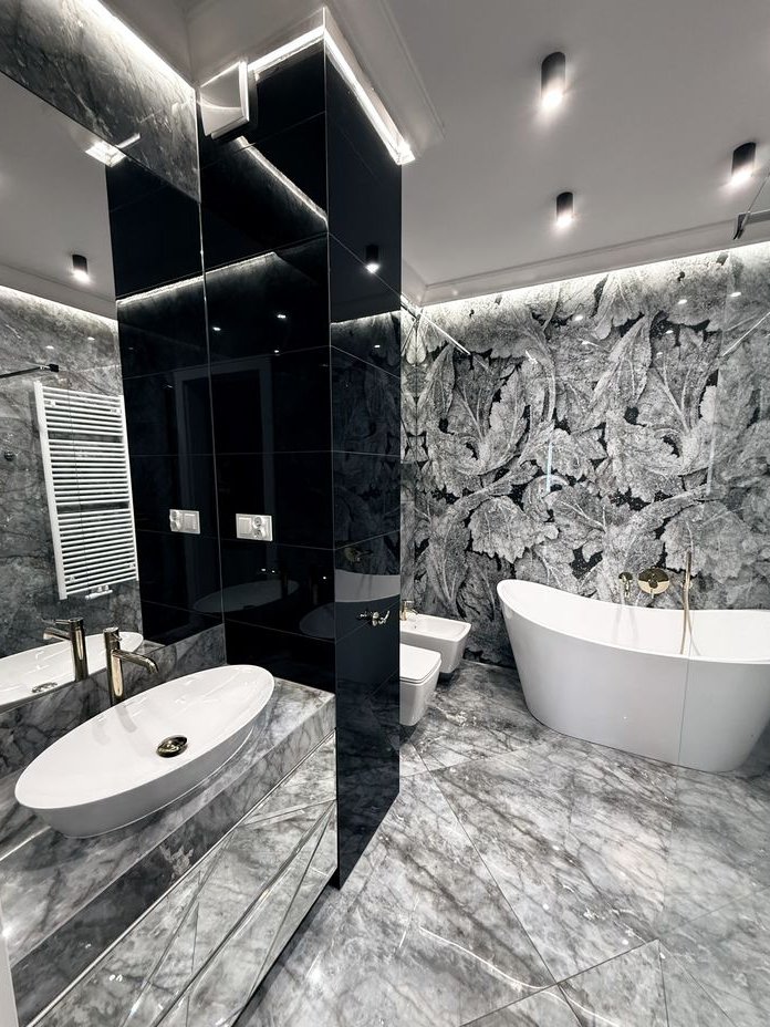 łazienka wykończona nowocześnie, z zastosowaniem płytek dużych formatów i spójnych detali