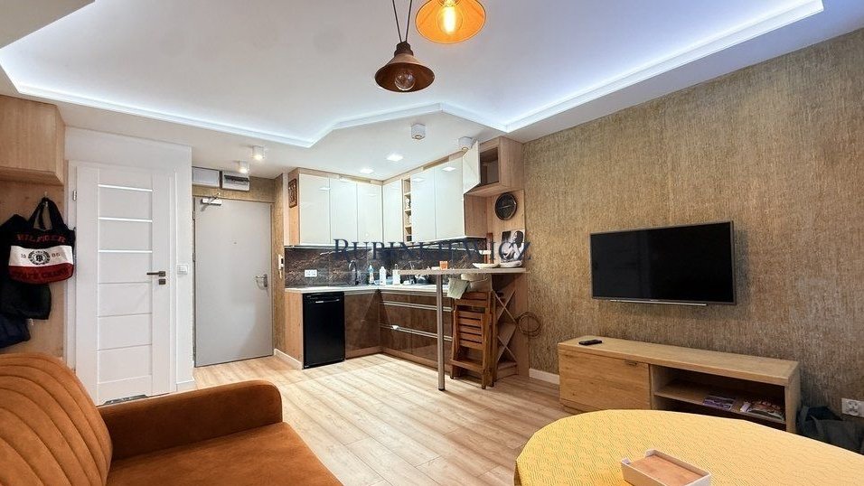 Apartament wykończony w dobrym standardzie, kuchnia zrobiona na wymiar ze sprzętem ADG, sprzedawany jest wraz z kompletnym umeblowaniem.