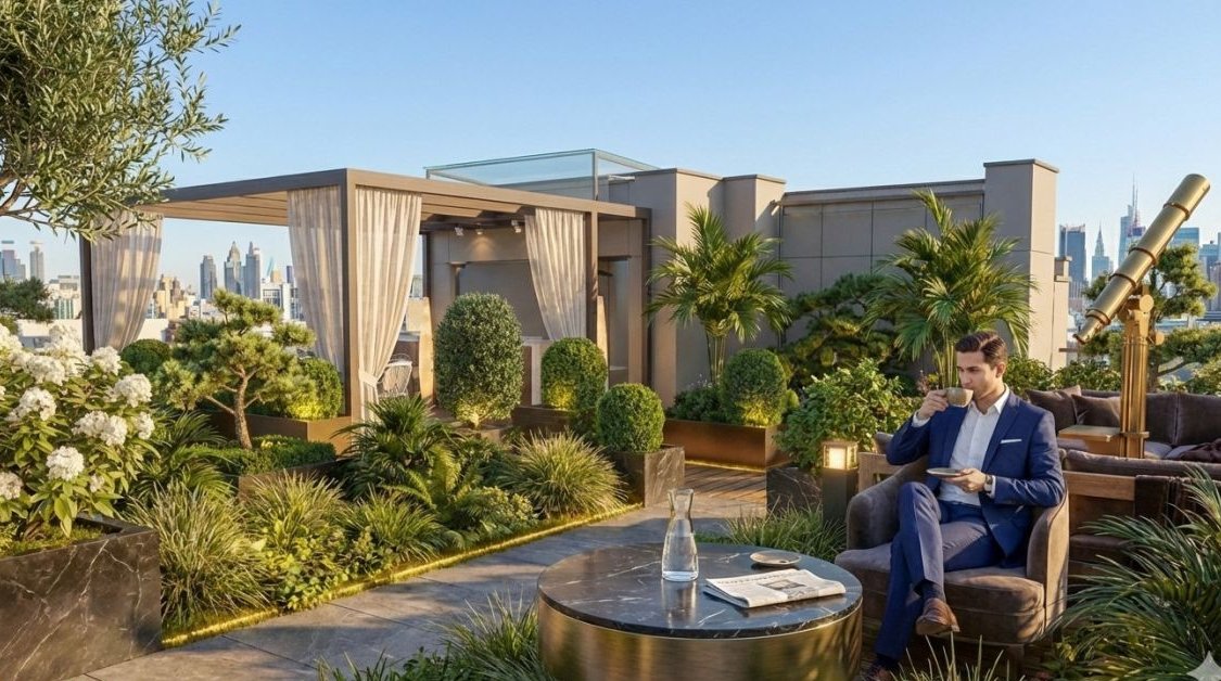 Zielony dach i reprezentacyjne patio dla mieszkańców.