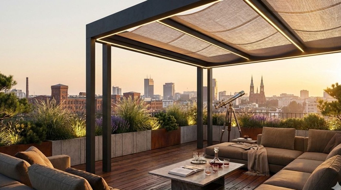 Jacuzzi na dachu budynku - prywatna strefa relaksu z widokiem na miasto.