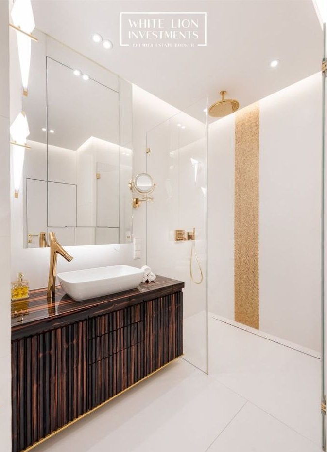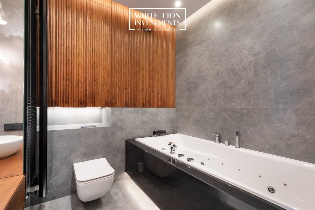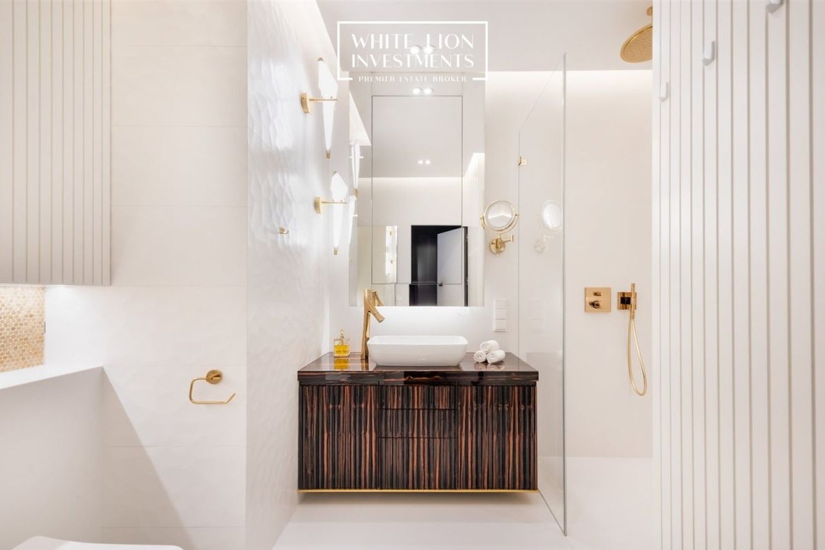 Łazienki: Dwie łazienki wykończone rzadkimi spiekami z Hiszpanii i Włoch. W salonie kąpielowym zachwyca architektura światła – starannie rozmieszczone punkty świetlne i podświetlane wnęki tworzą atmosferę relaksu. Znajdziemy tu armaturę Axor Starck Organic oraz efektowną, sufitową wylewkę Gessi Goccia. Relaks zapewnia robiona na zamówienie wanna z hydromasażem Ruben.